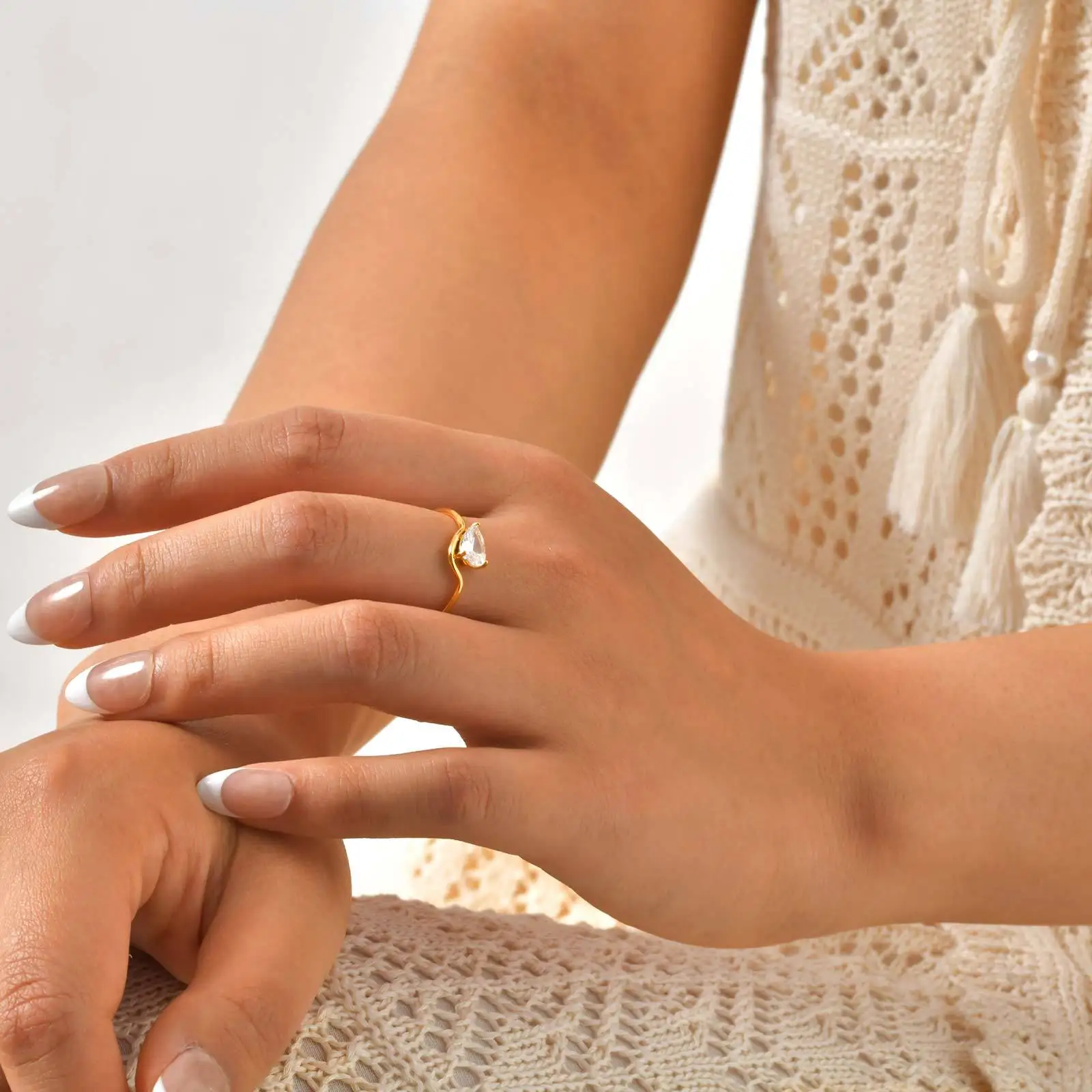 Personality Popular Style Women Girl Engagement Rings Stainless Steel Gold Plated Waterdrop Shape Zircon Ring