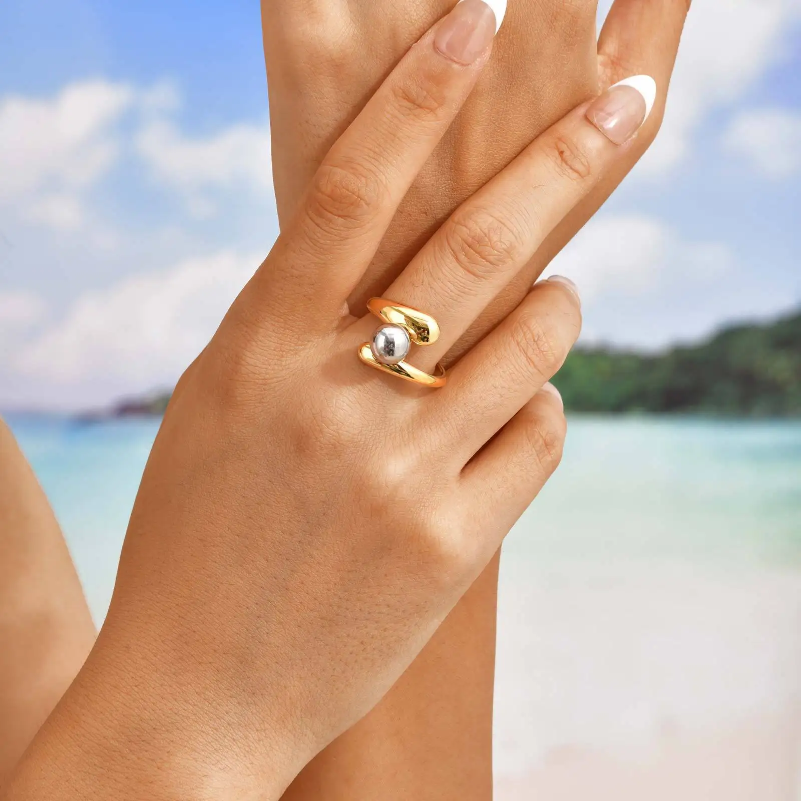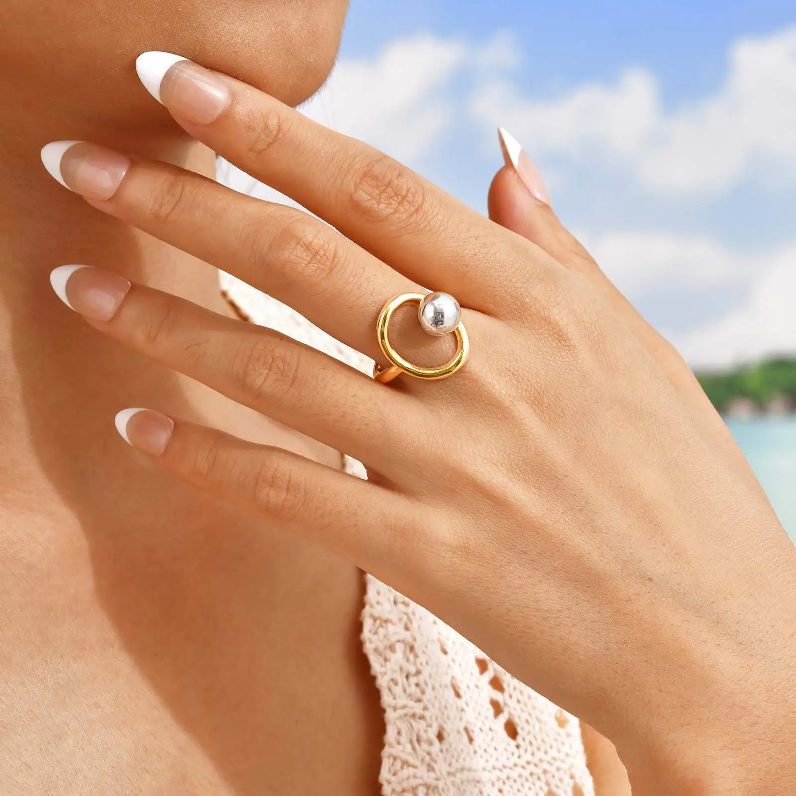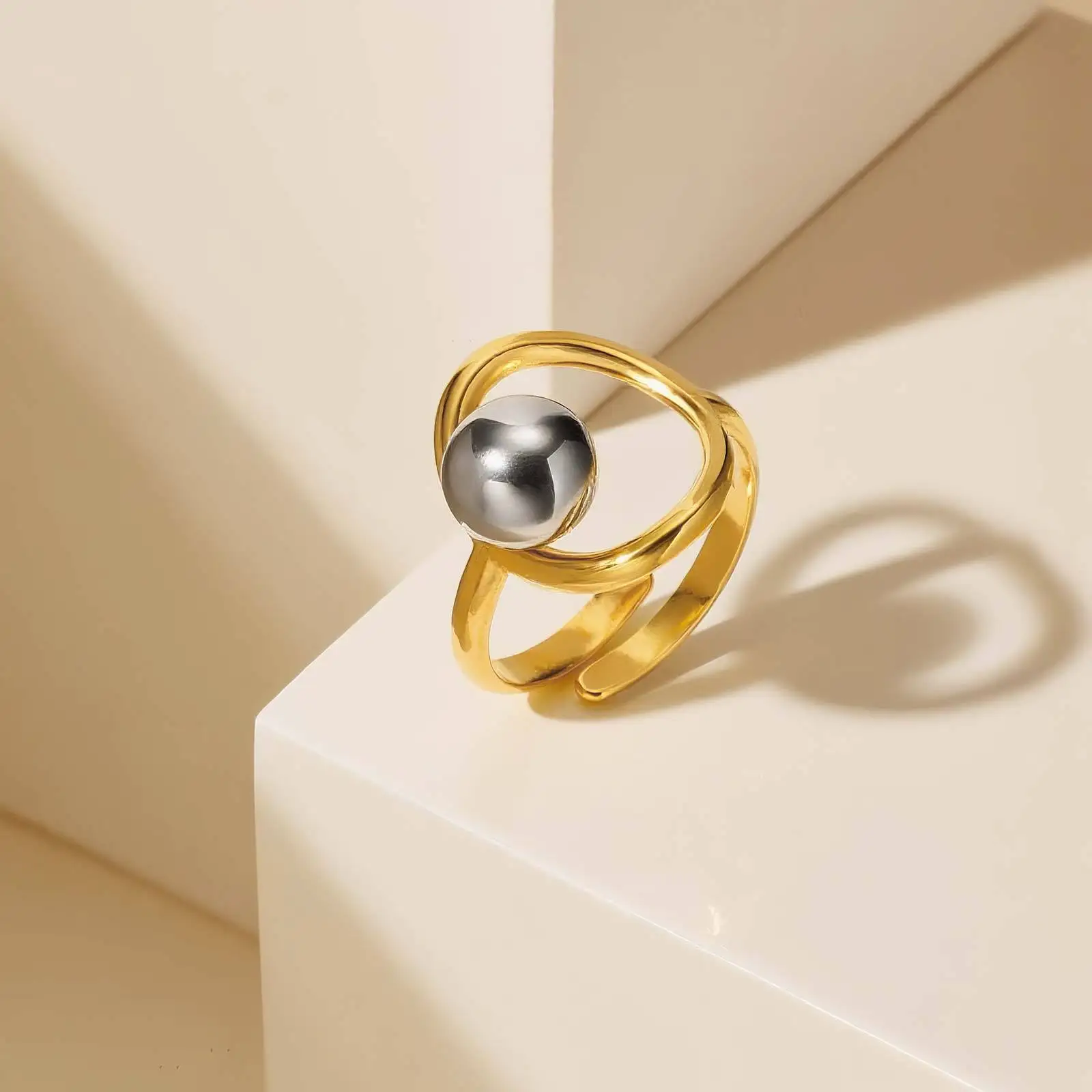 High-End Ins Style Adjustable Geometric Pattern Metal Ball Decor Open Ring Stainless Steel Cuff Rings Women