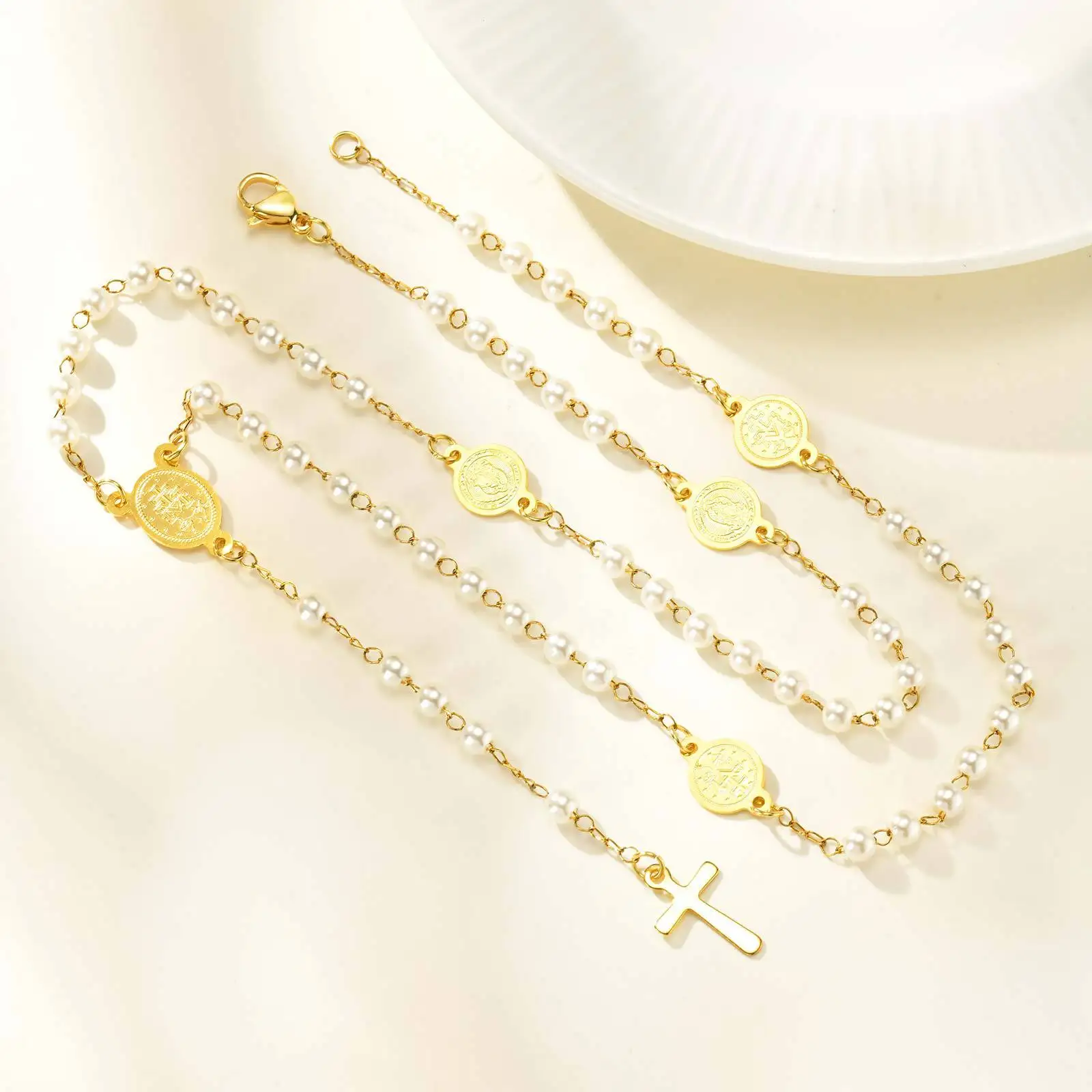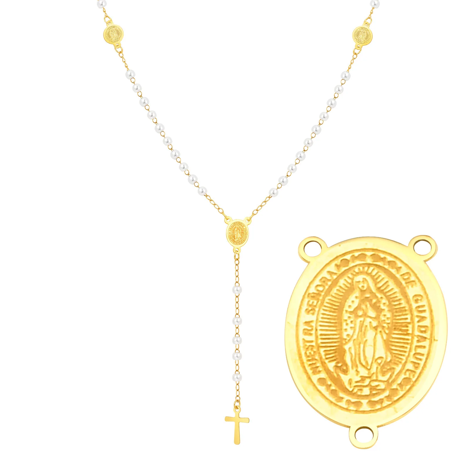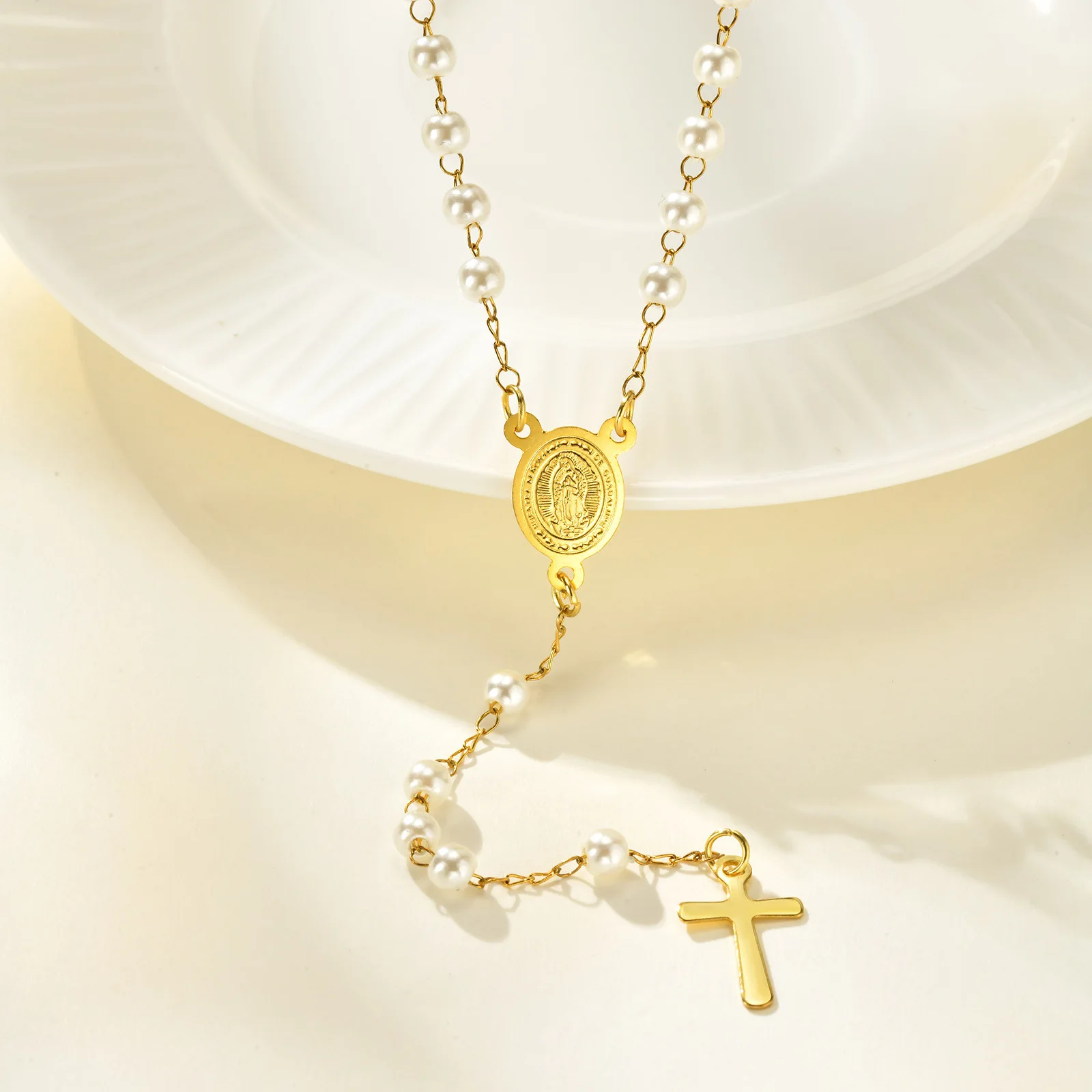 Religious Long Prayer Pearl Beads Cross Pendant Jewelry Necklace Oval Holy Mother Y Shaped Pendant Necklace for Women