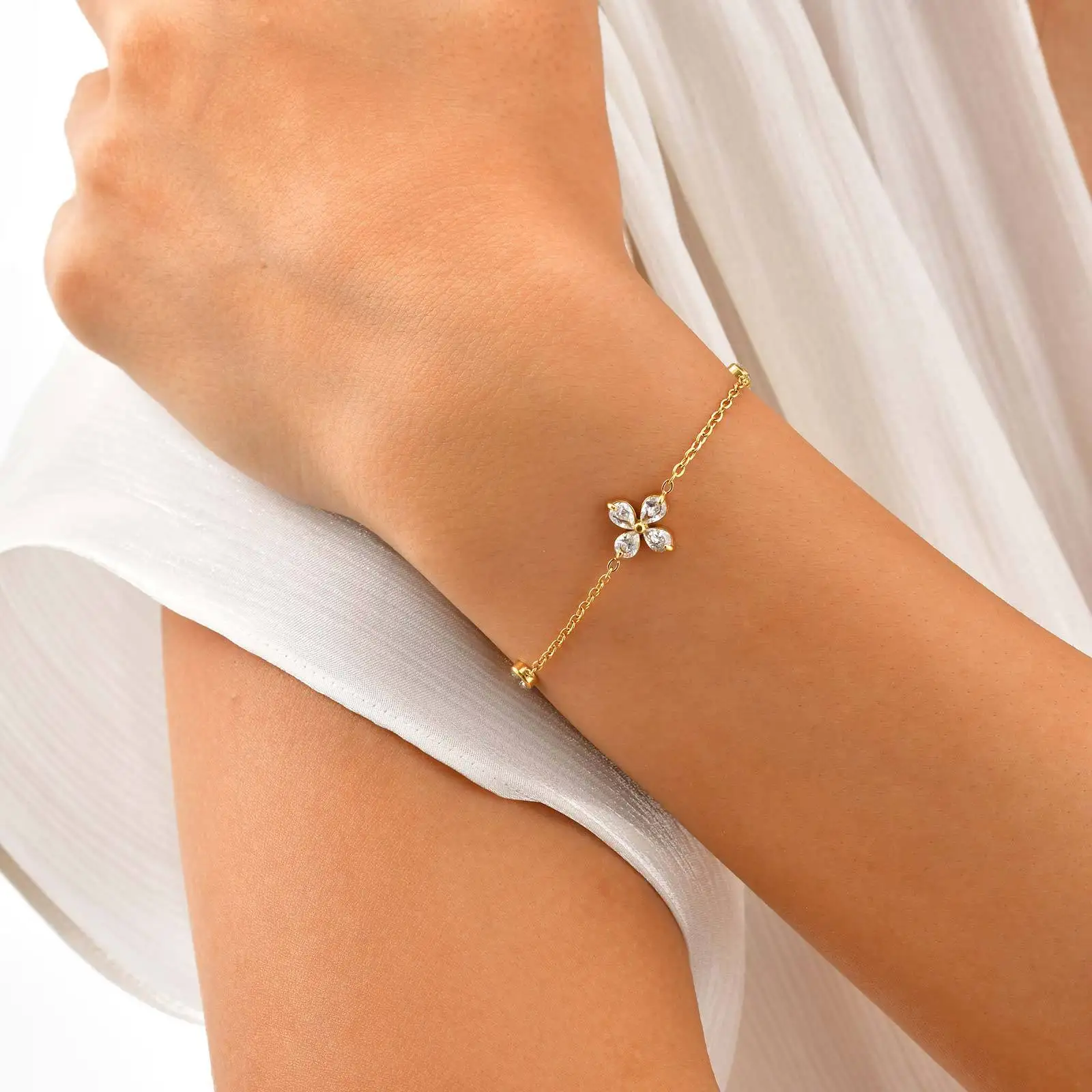 Simple Design Shiny Zircon Flower Bracelet Stainless Steel 18k Gold Plated Dainty Chain Bracelet Women Exquisite Jewelry