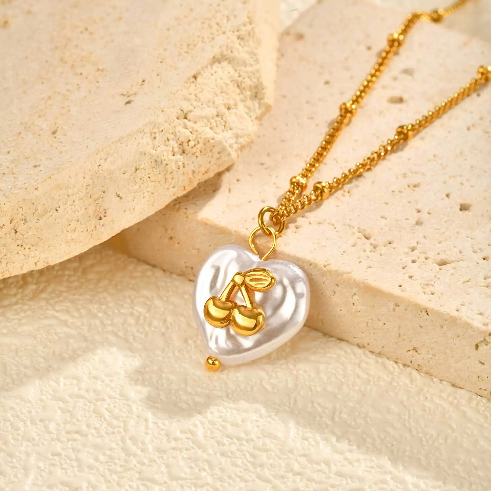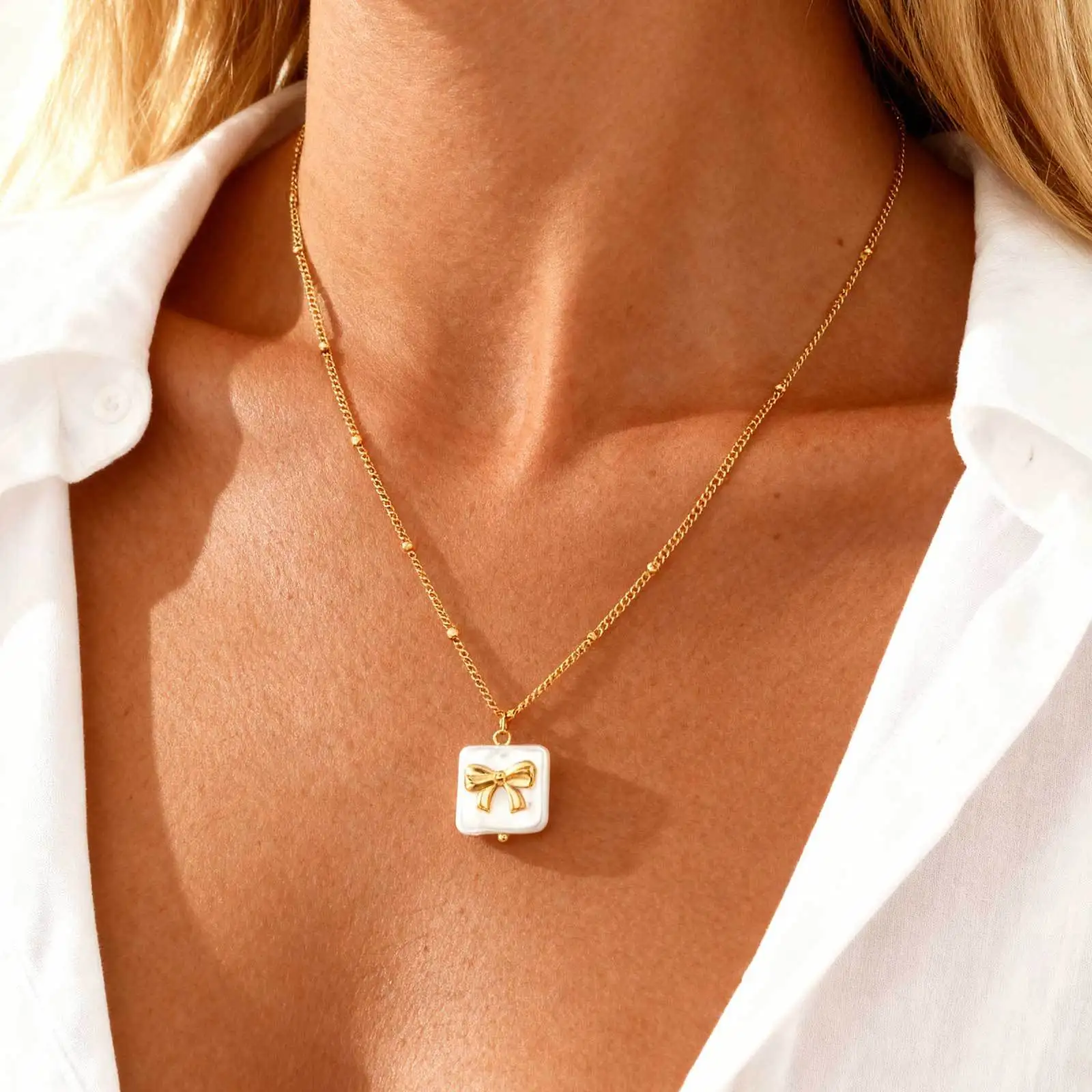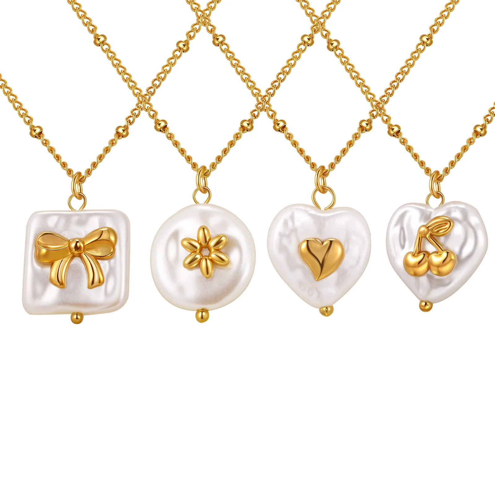 Fine Jewelry Women White Pearl Bowknot Charm Necklaces Stainless Steel Gold-Plated Heart Love Pendant Necklace