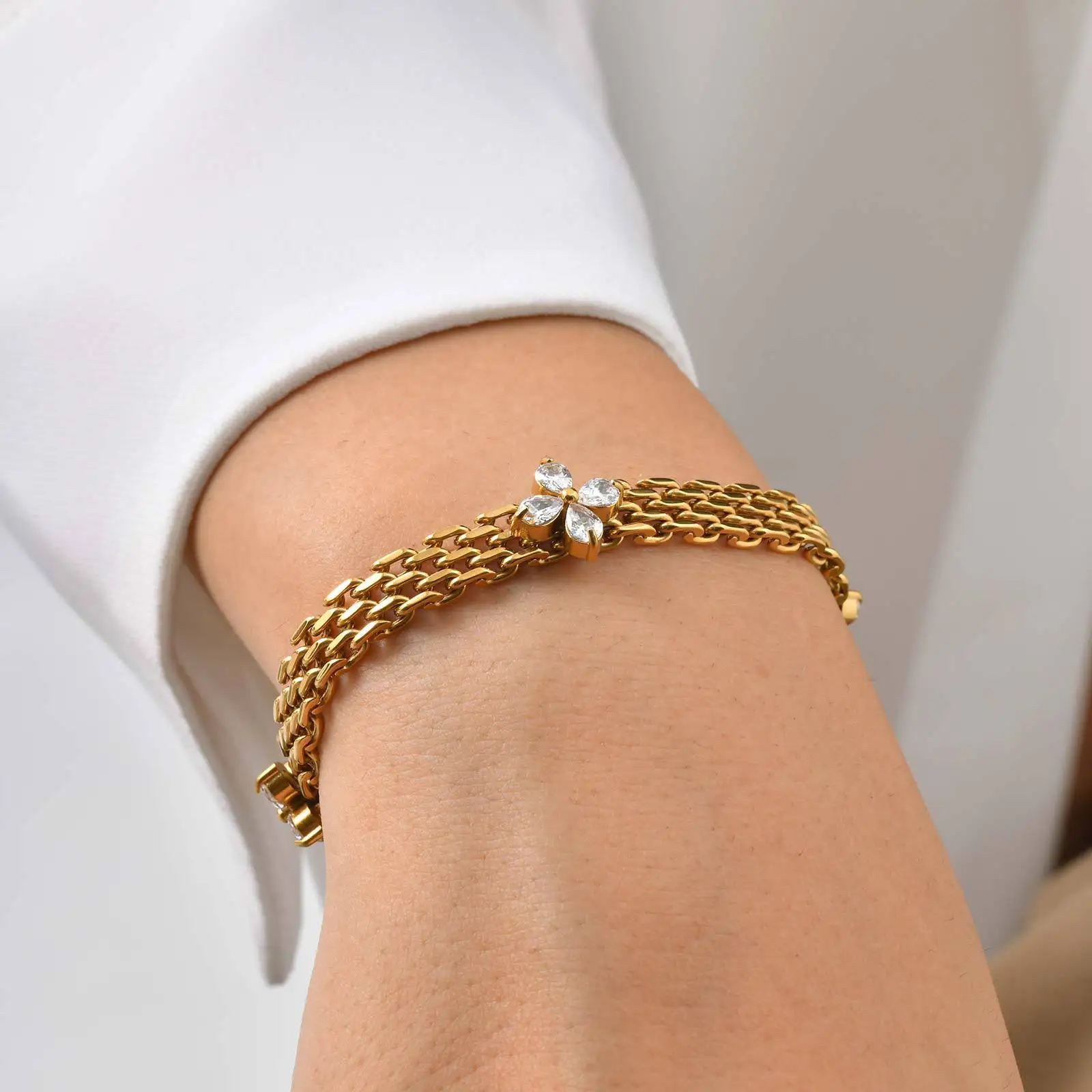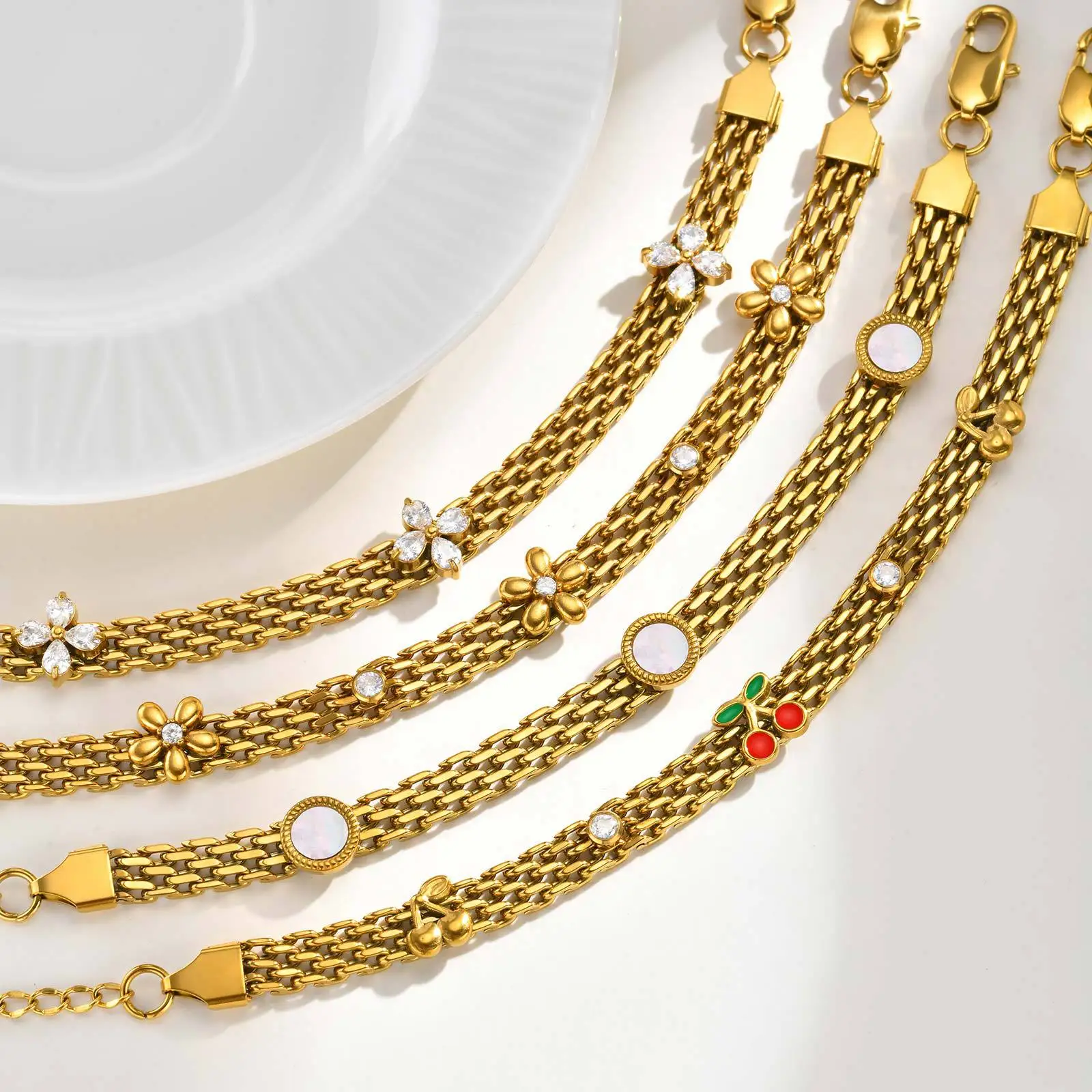 High End 18k Gold Plated Women Zircon Flower Chunky Mesh Chain Bracelet Cherry Stainless Steel Strap Chain Bracelet
