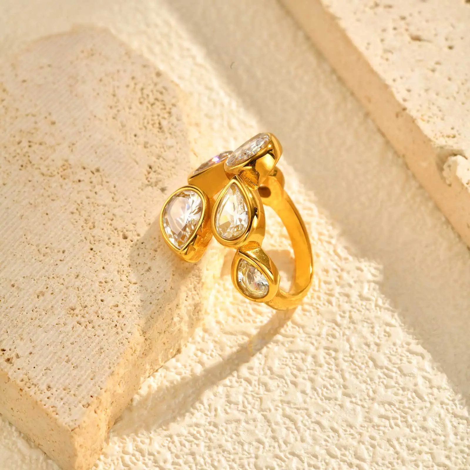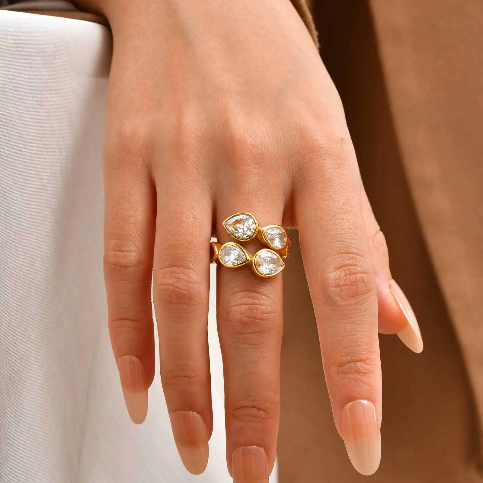 Vintage Style Dainty Designstainless Steel Jewelry Ring Waterdrop Shape Zircon Open Ring for Girls