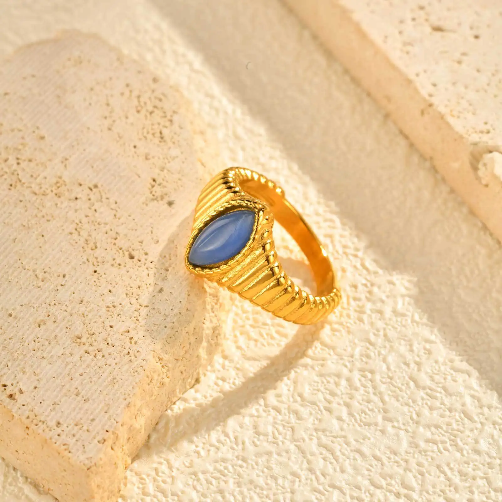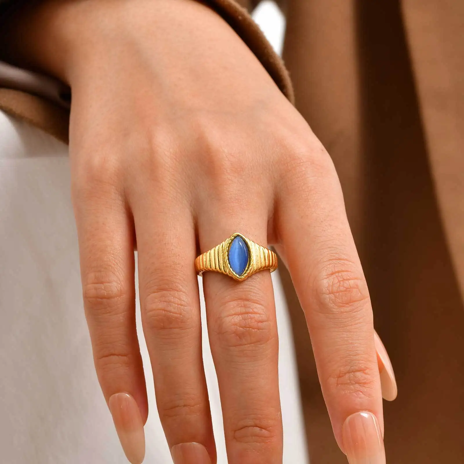 Simple Dainty Design Small Oval Cat's Eye Stone Ring Stainless Steel Gold Plated Jewelry Finger Rings