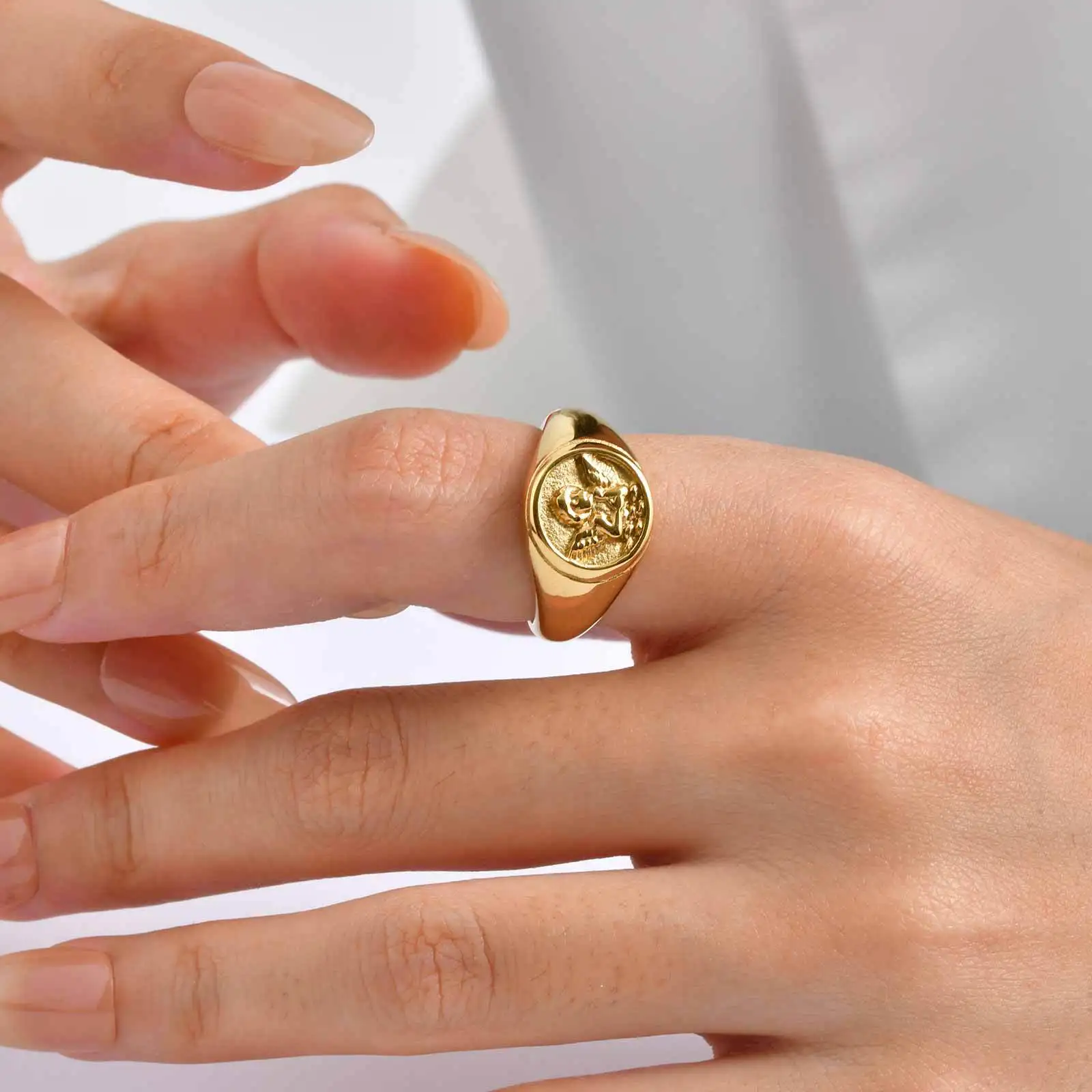 Ins Style Personality Design 18k Gold Plated Stainless Steel Chunky Ring Angel Little Boy Embossed Rings Jewelry Women