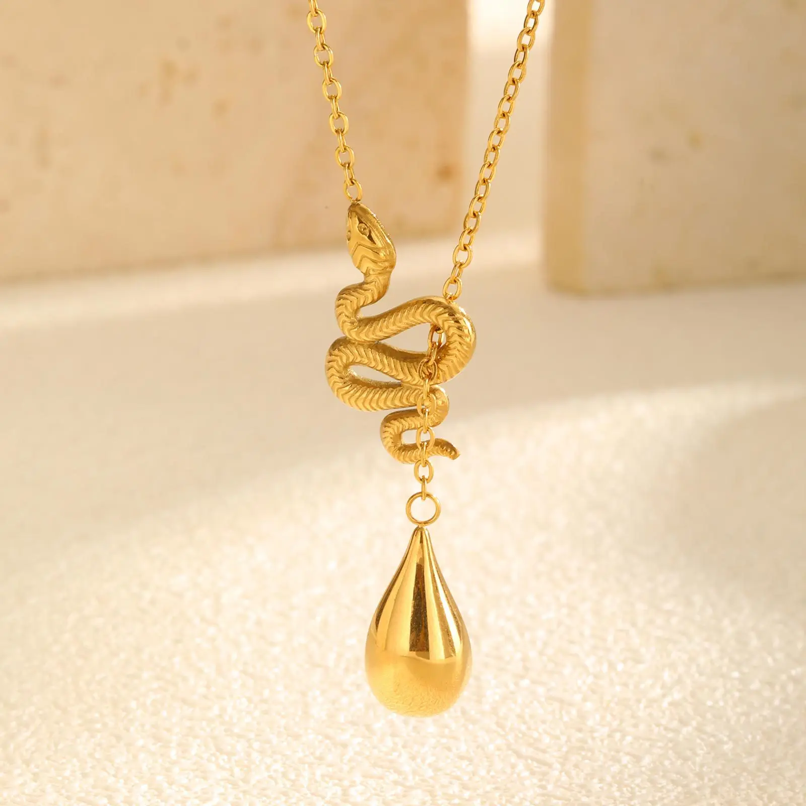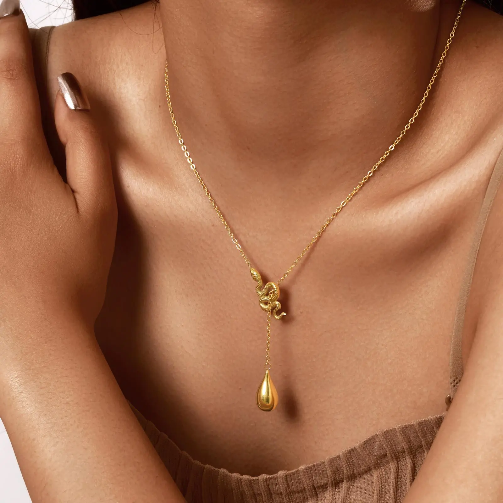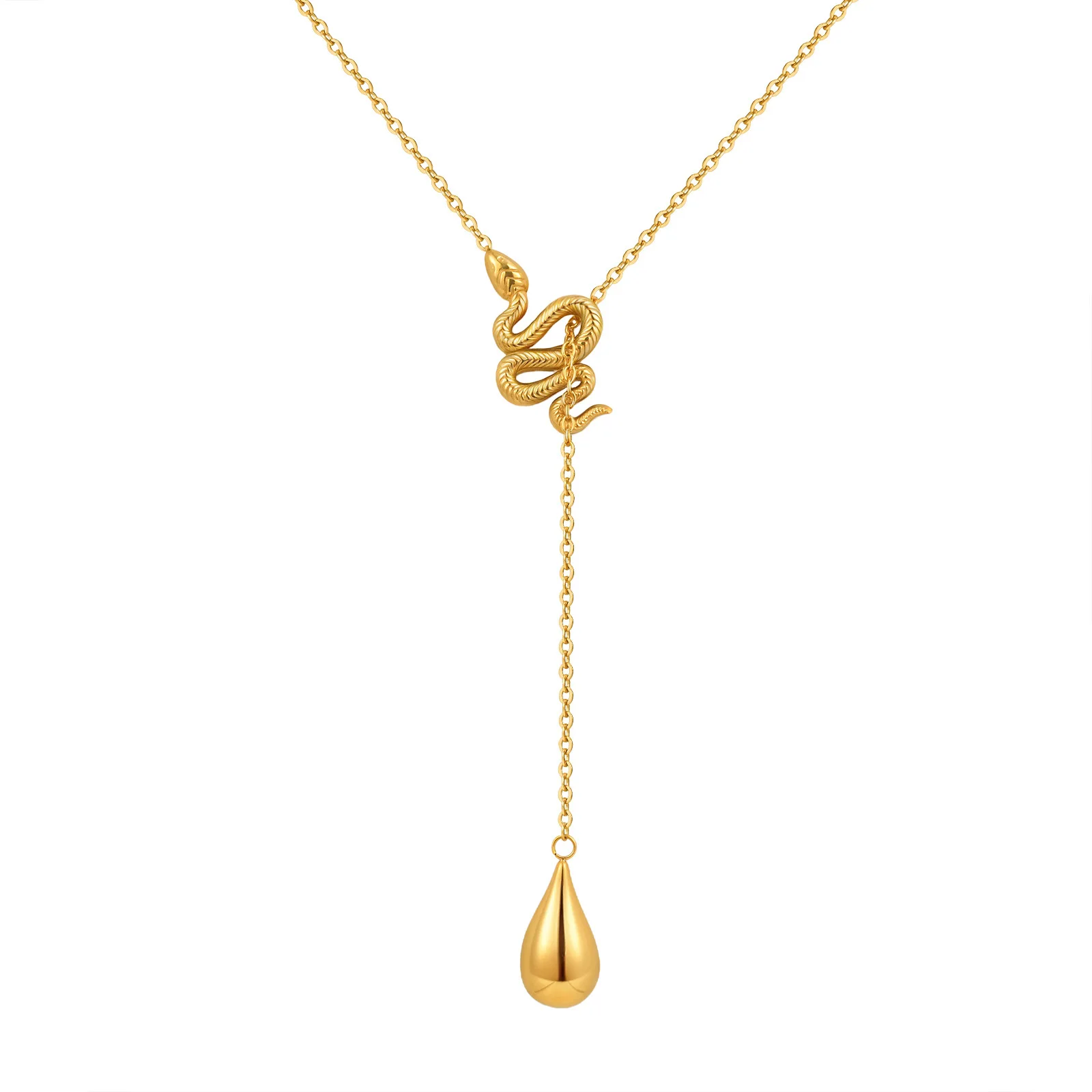 Trendy Jewelry Waterproof 18k Gold Plated Stainless Steel Necklace Snake Water Drop Y Shaped Pendant Necklace for Women