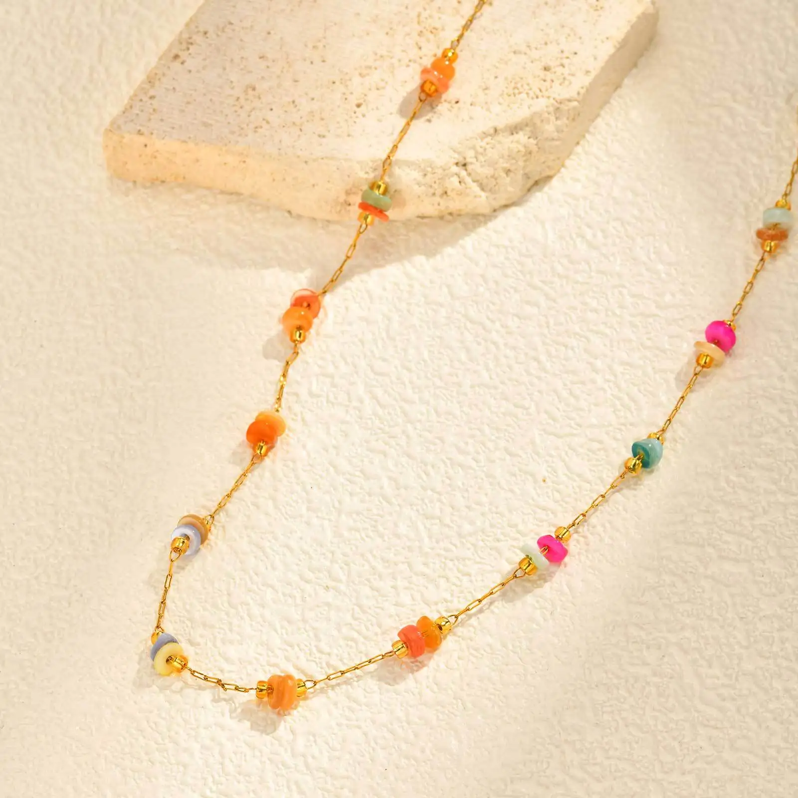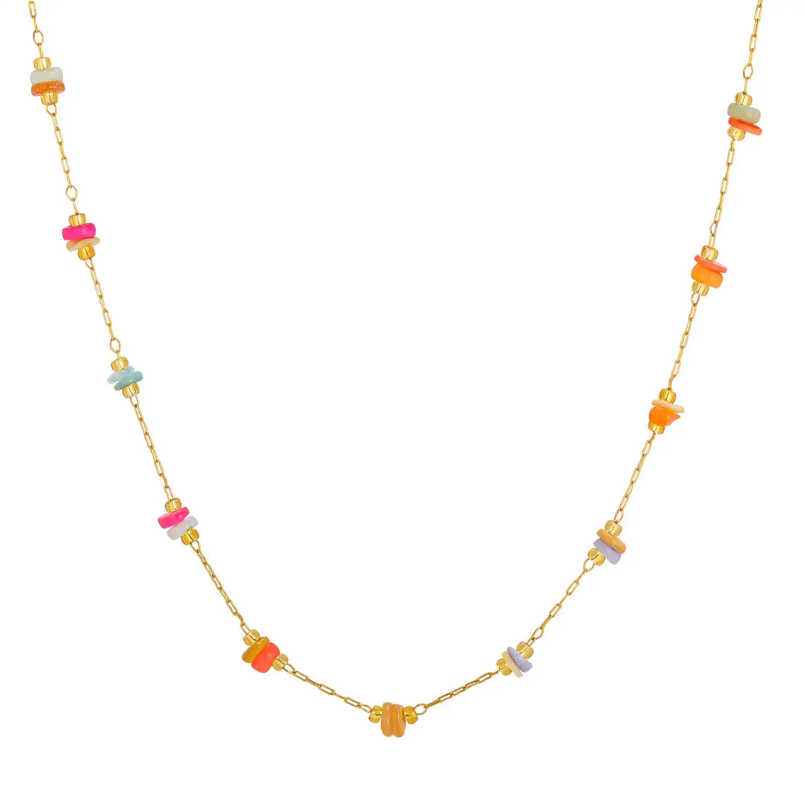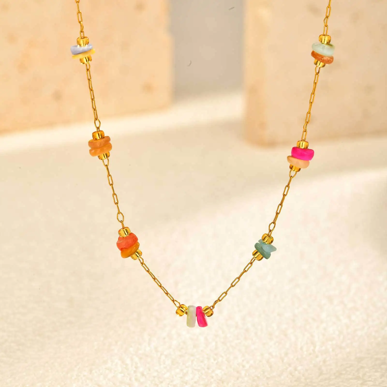Gold Stainless Steel Ocean Necklace Colorful Stone Beaded Choker Collarbone Chain Retro European Style Jewelry