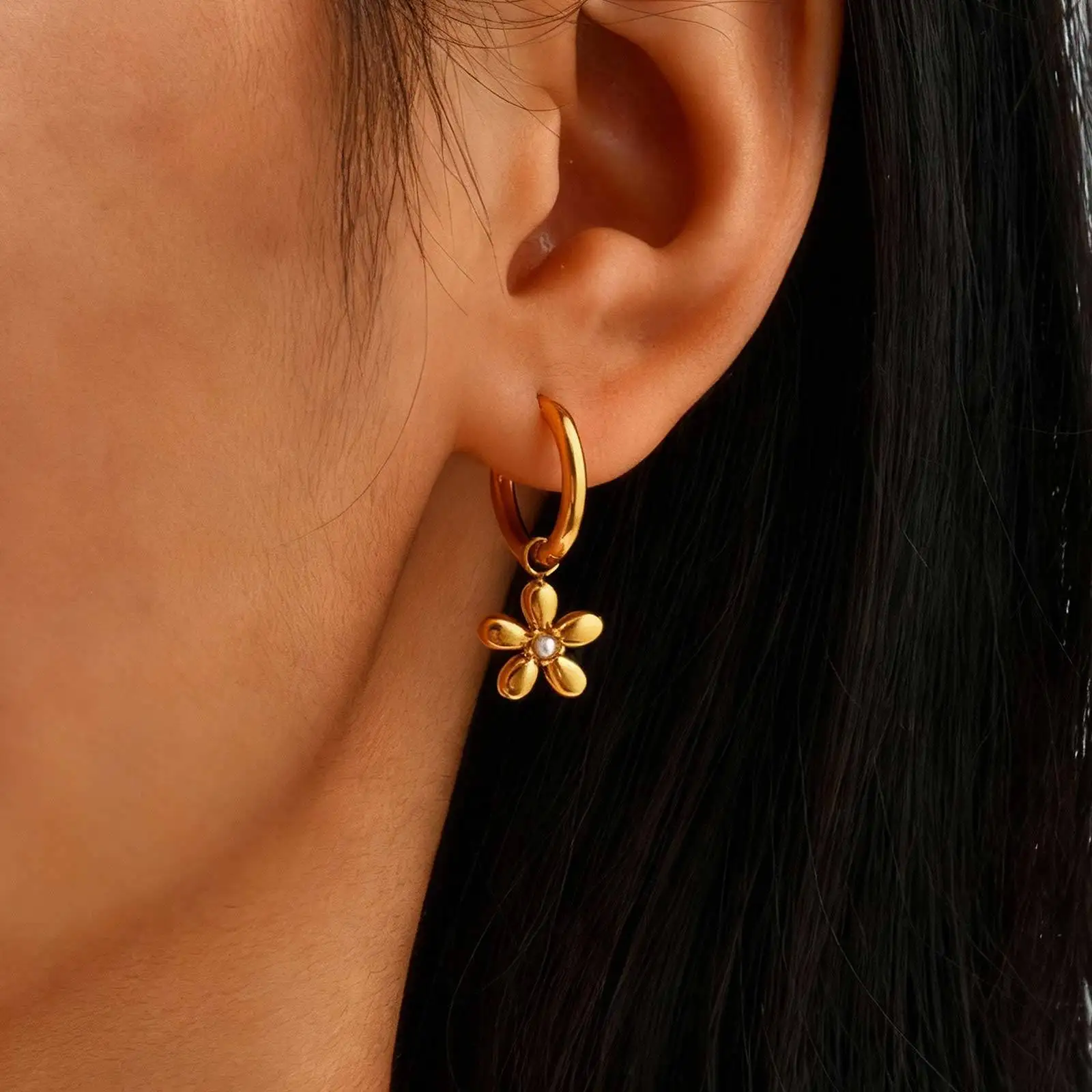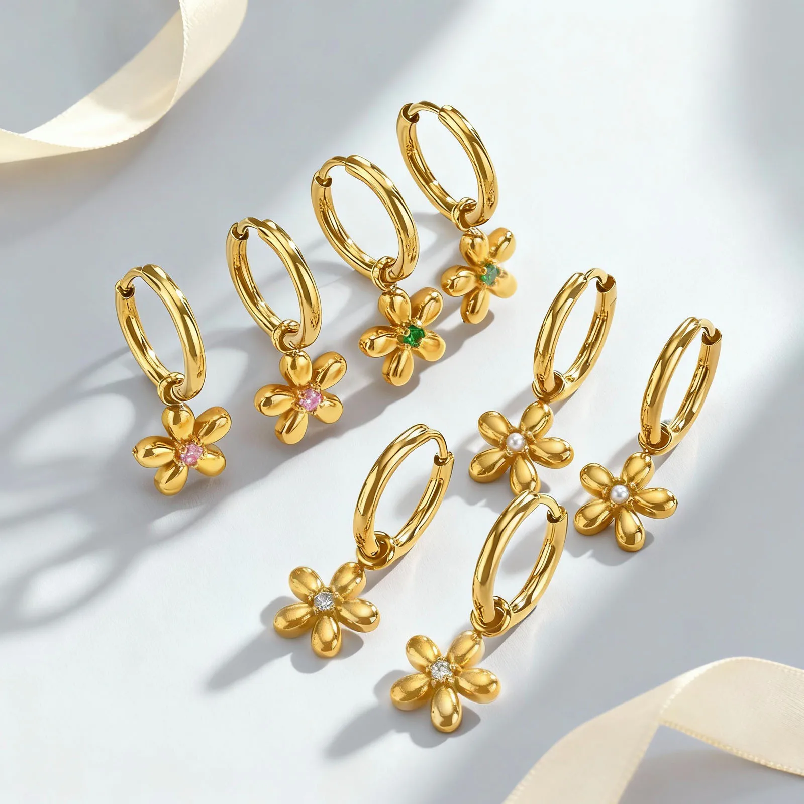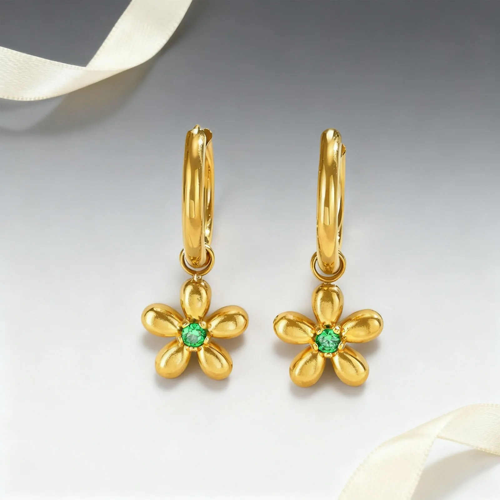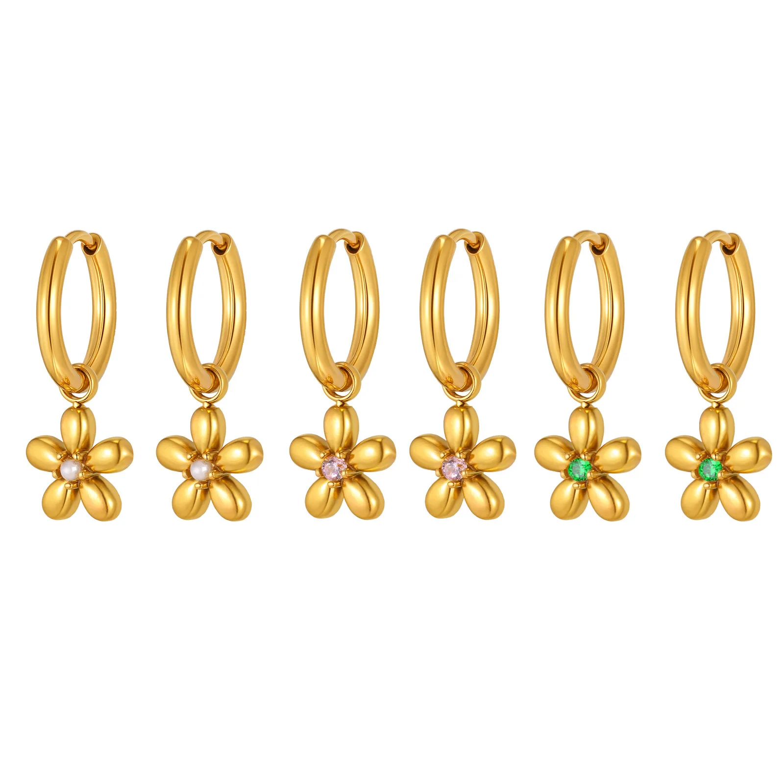 Fashion Flower Earrings Gold Pink Green Zircon Stainless Steel Polished Surface Stud Earrings for Women Bulk Order