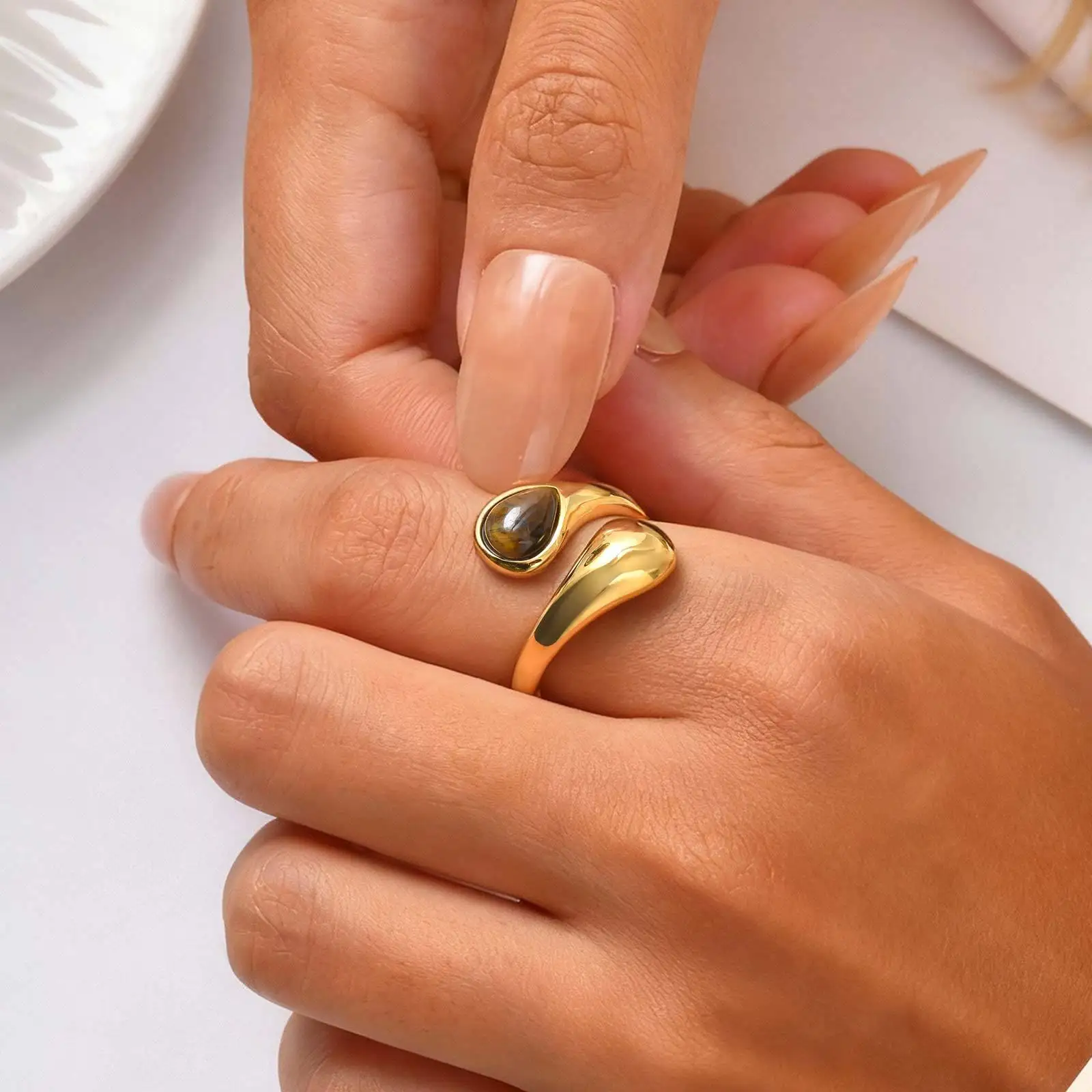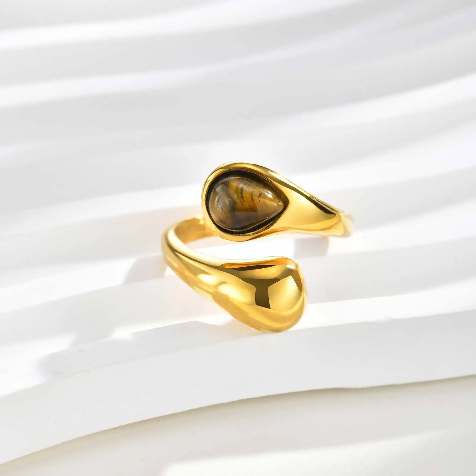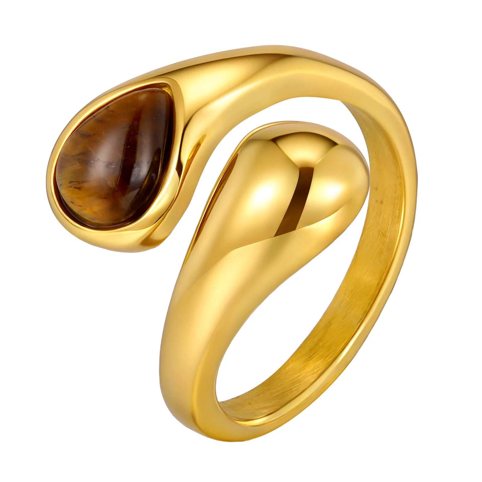 Gold Water Drop Ring Tiger Eye Stone Stainless Steel Hypoallergenic Vintage Jewelry for Women Wholesale