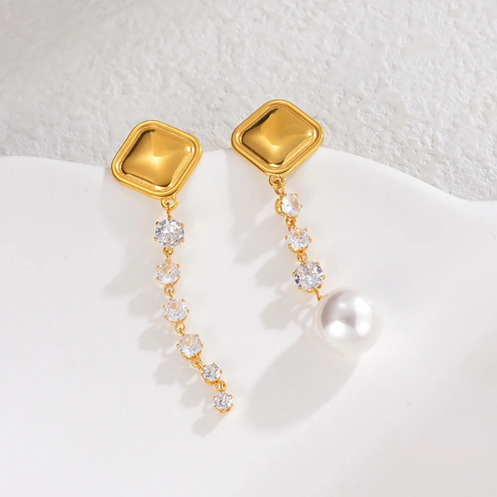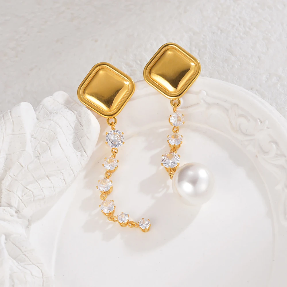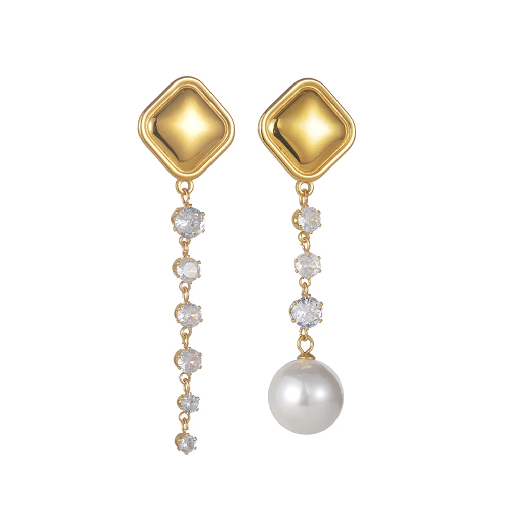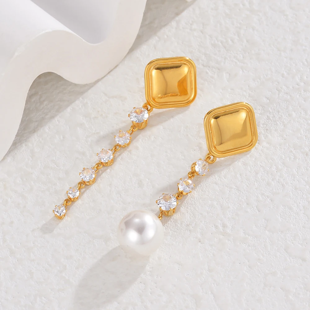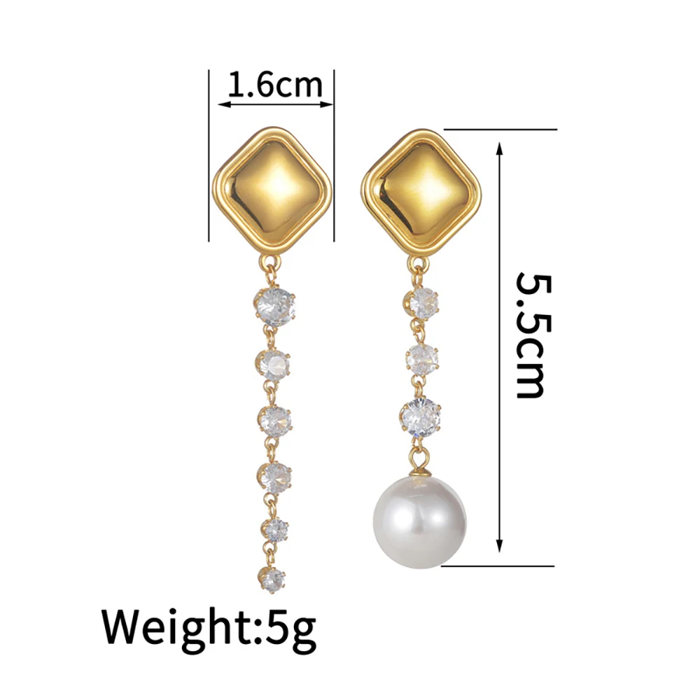 YUKAM Square Geometric Stainless Steel Long Tassel Earrings Zircon Pearl Exaggerated Asymmetric Dangle Earrings Jewelry