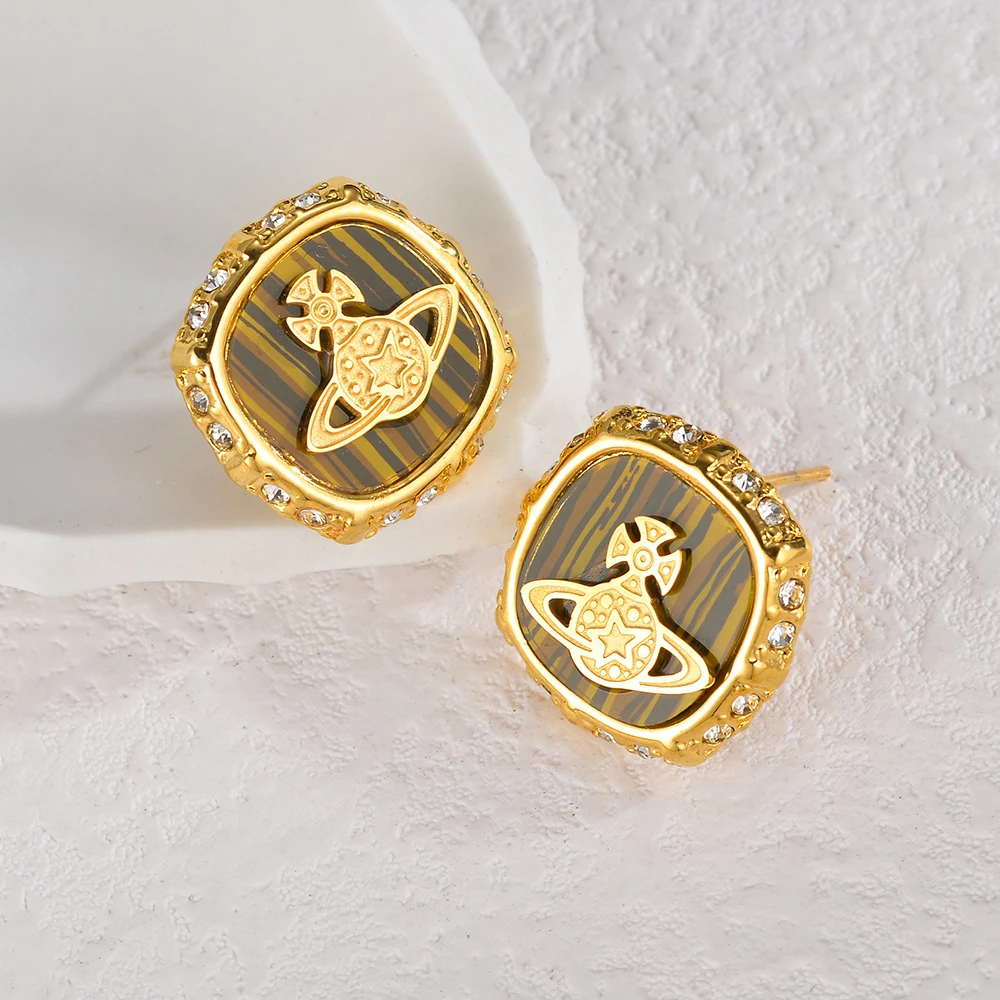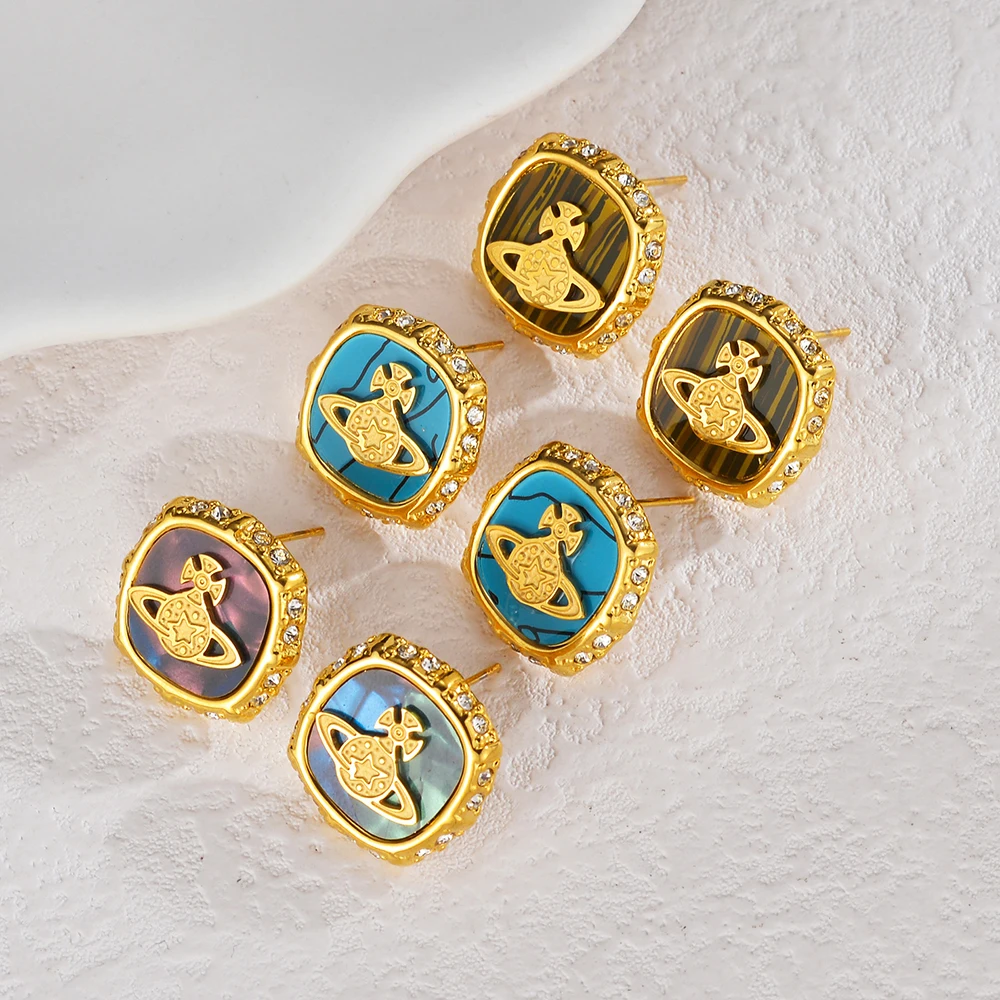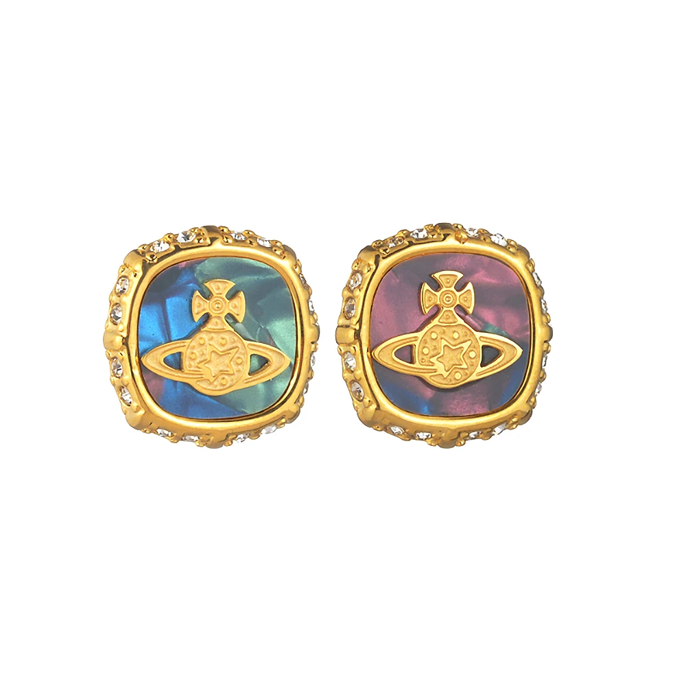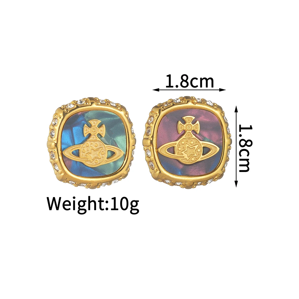 YUKAM Niche Fashion Retro Stainless Steel Gold Plated Crystal Square Abalone Shell Acrylic Planet Saturn Stud Earrings for Women