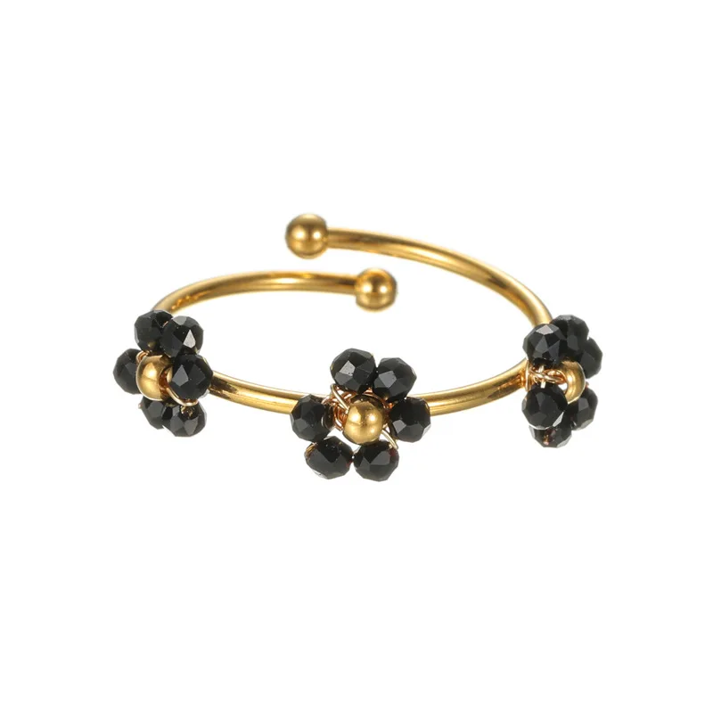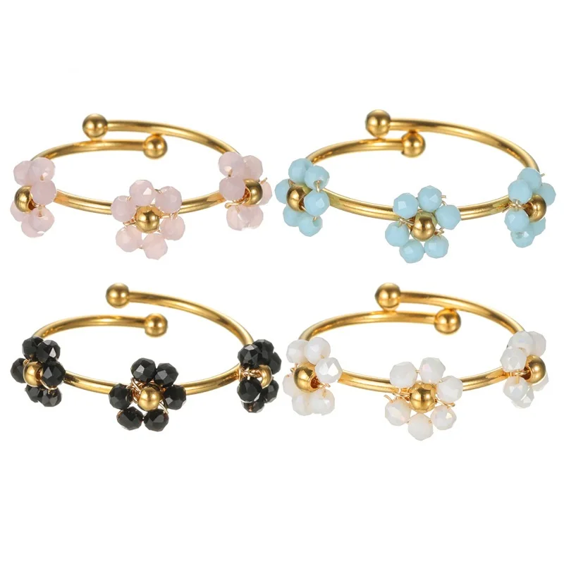 Fashion Jewelry Adjustable Ring Glass Flower Beaded Ring Women 18K Gold Plated Stainless Steel Opening Rings