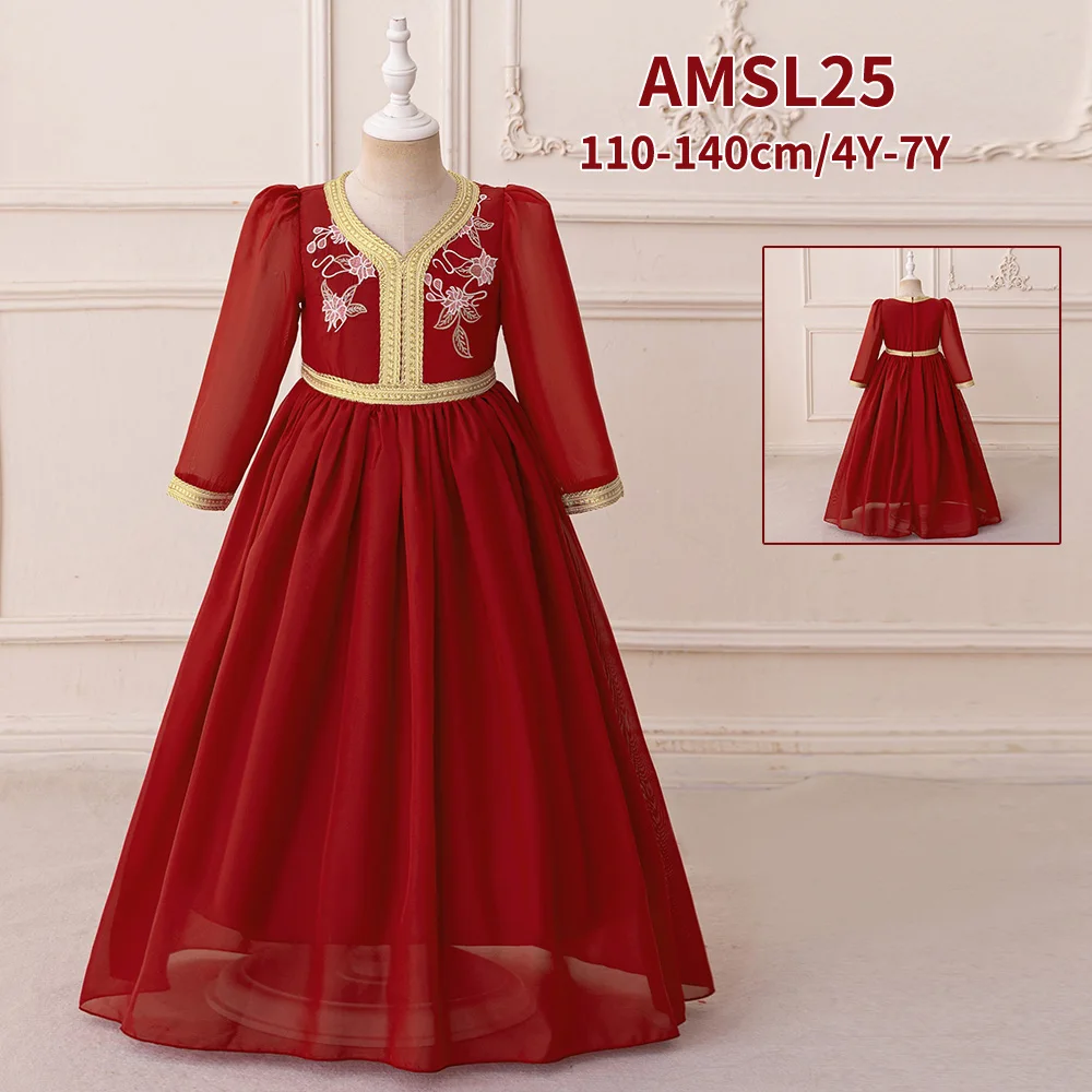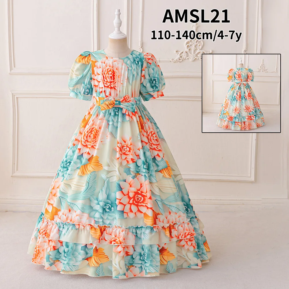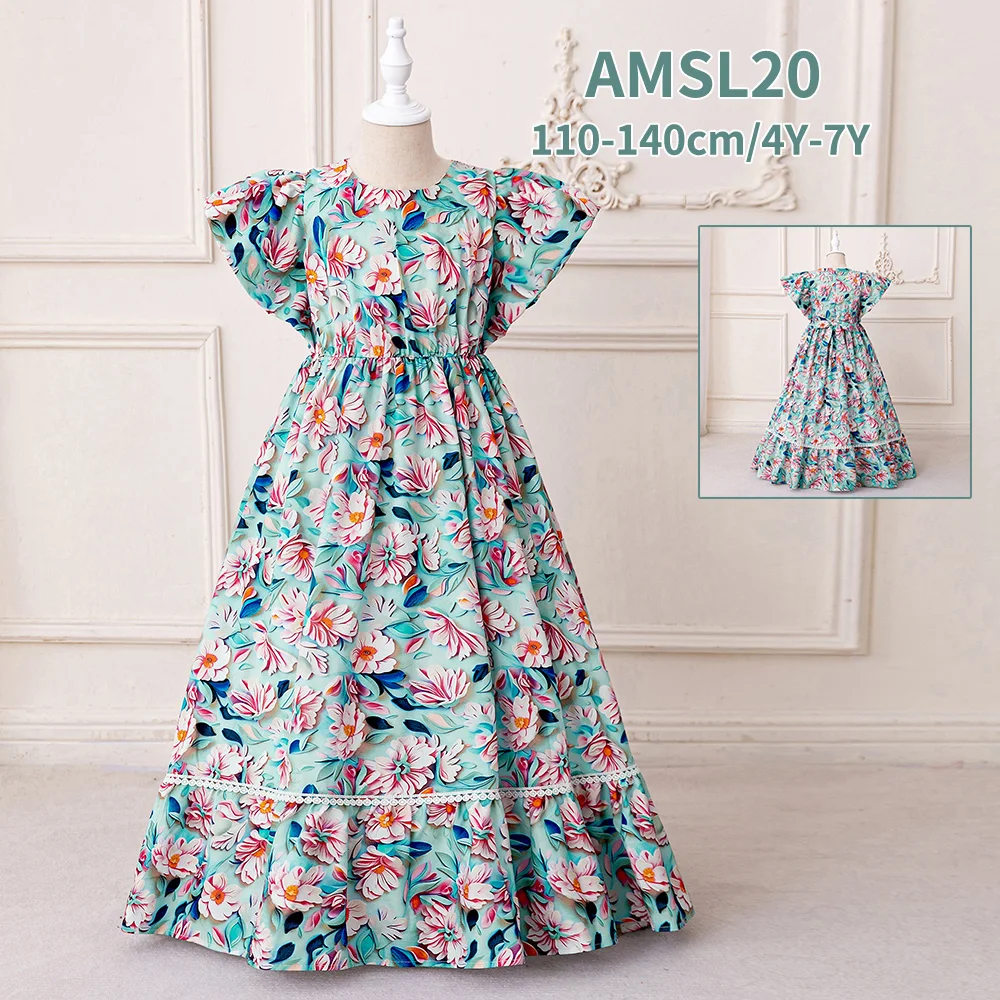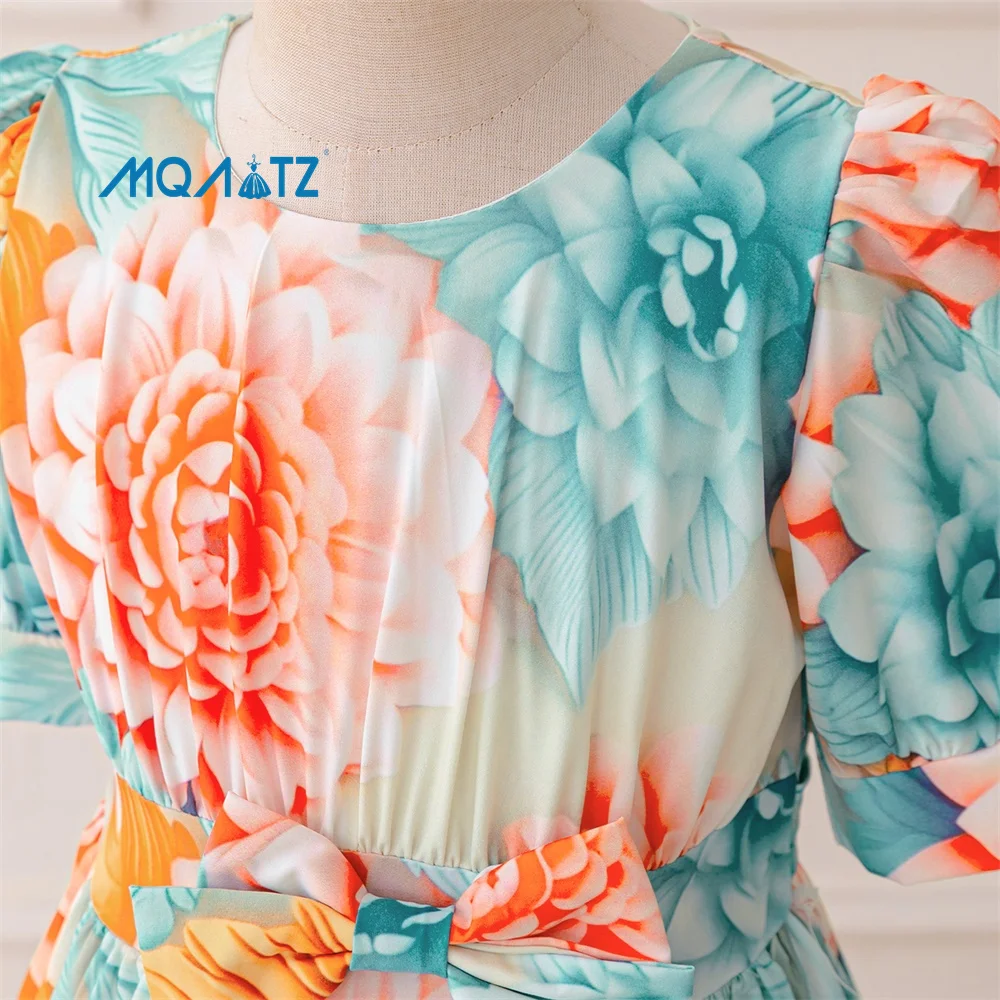 MQATZ Floral Satin Dress Girls Printed Appliques Formal Muslim Eid Style Summer Wear for Children Parties