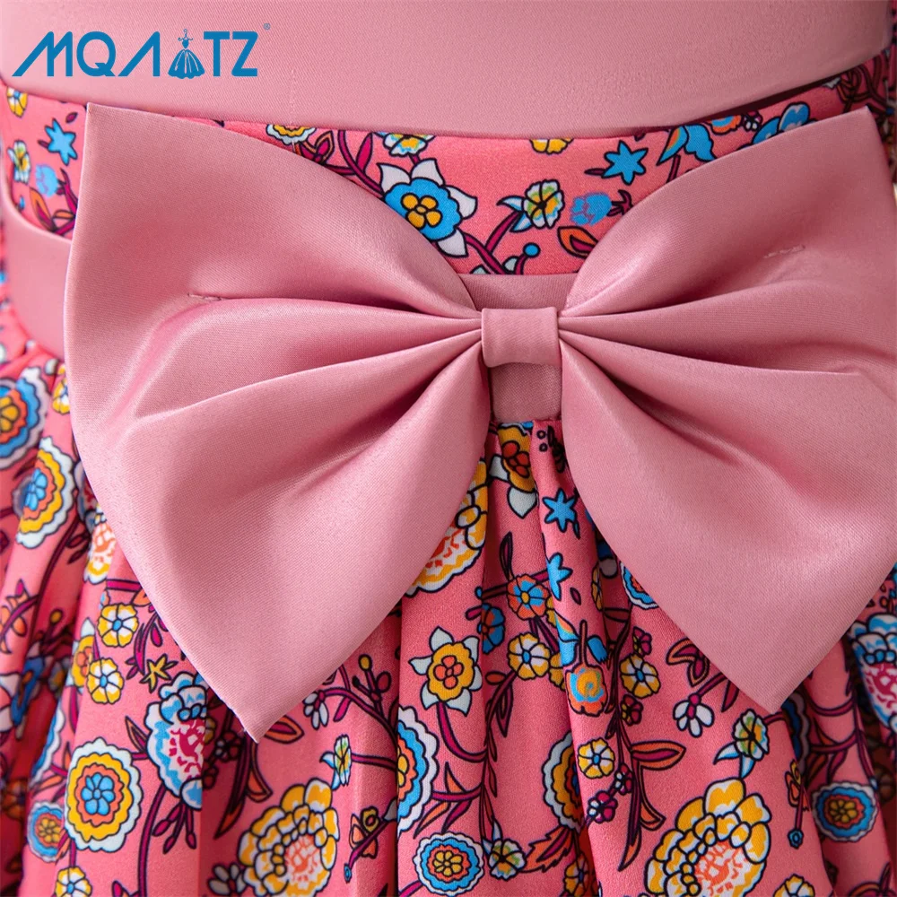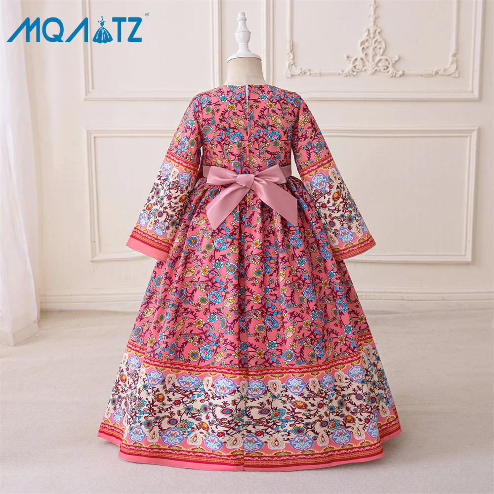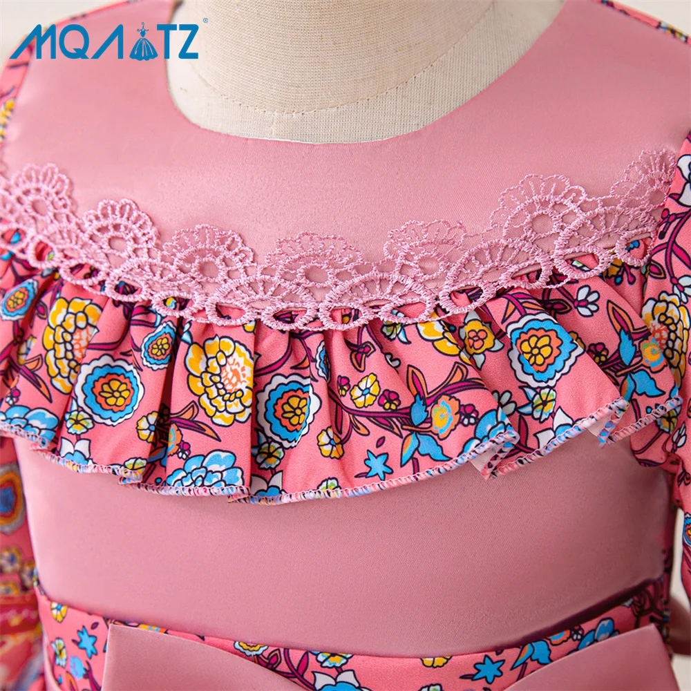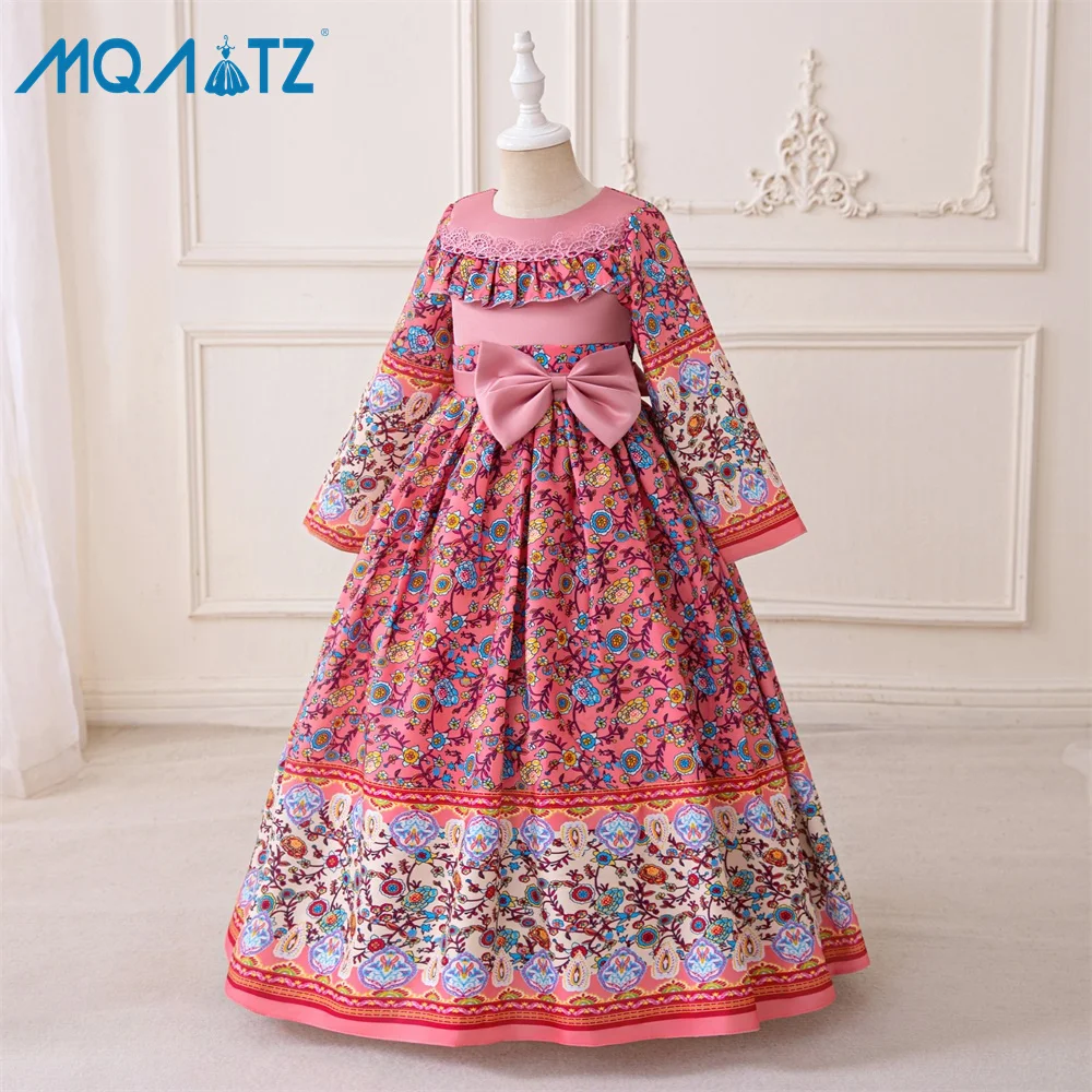 MQATZ Vintage Floral Print Girls Evening Dress Long Sleeve Court Style Bowknot Lace Piano Performance Dress