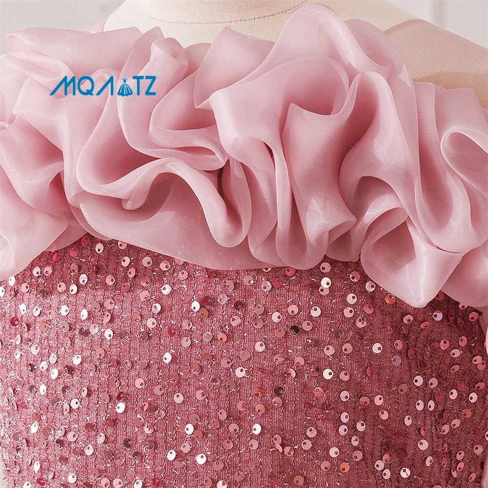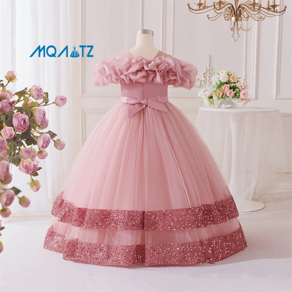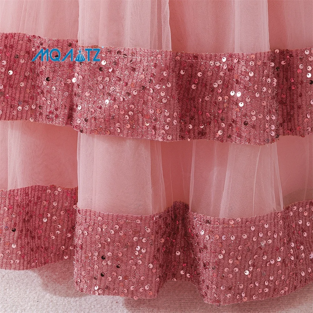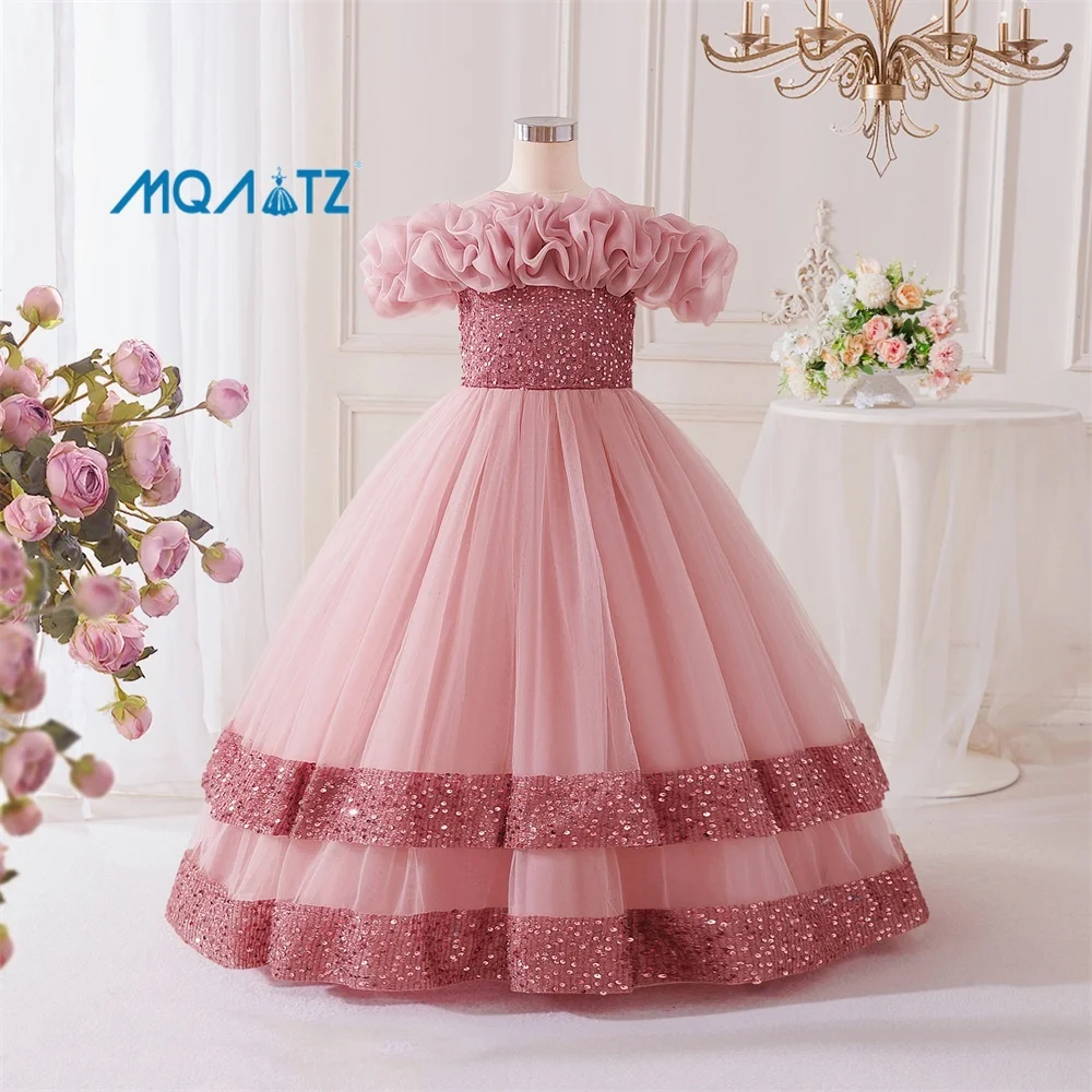 MQATZ Kids Ball Gown for 10-Year-Old Flower Girls Long-Sleeved with Sequin Embroidery Mesh Layering O-Neck Wedding Party Pattern