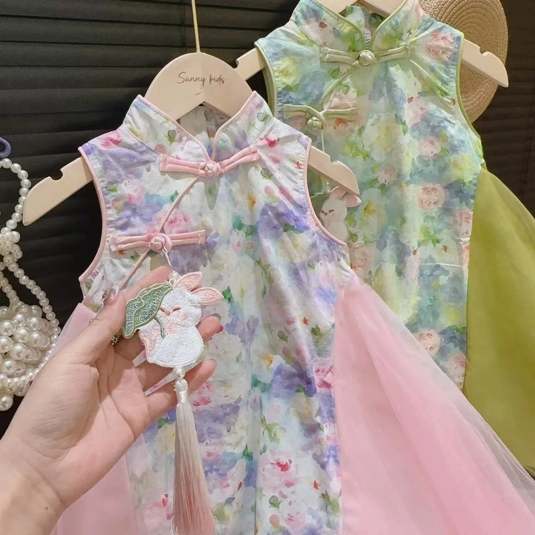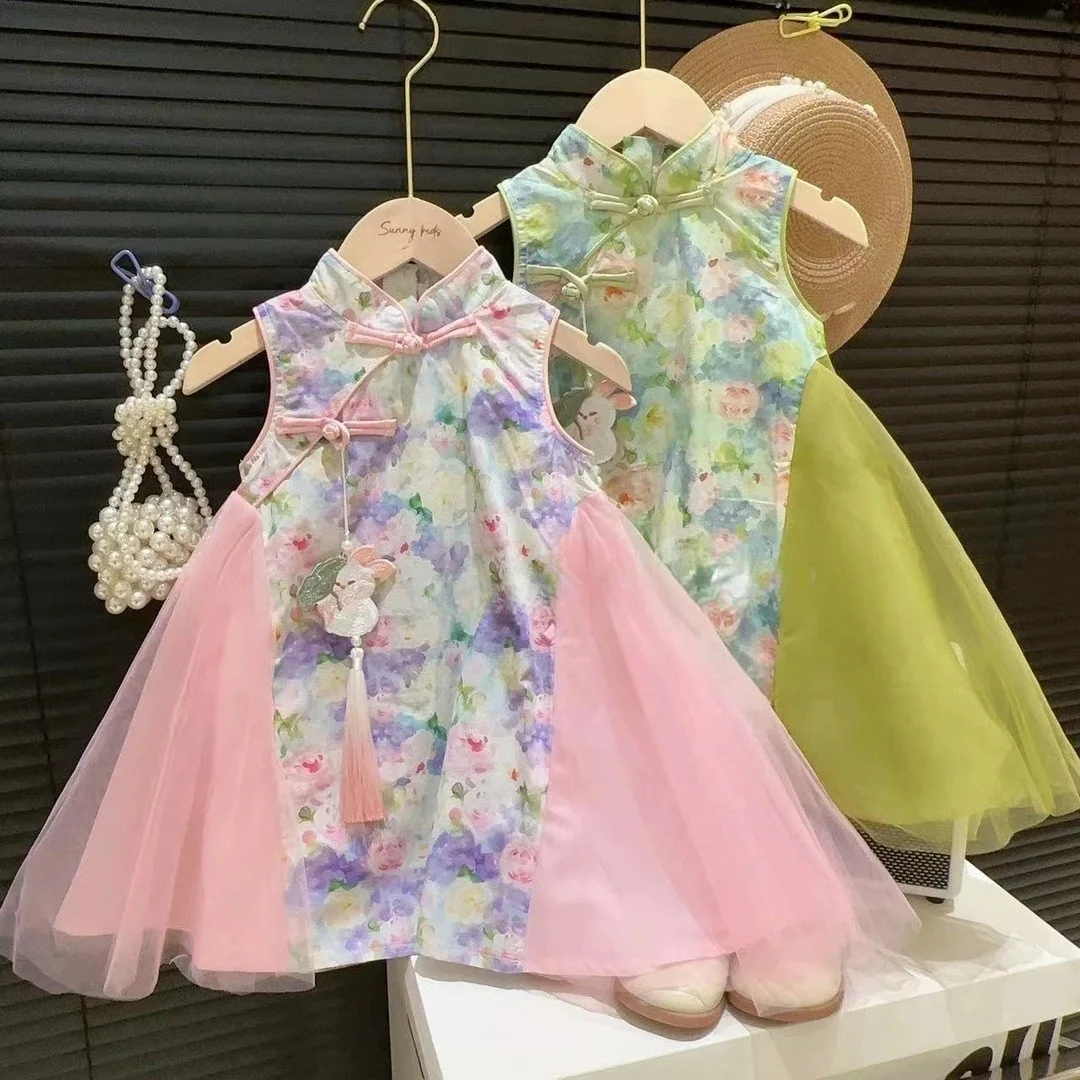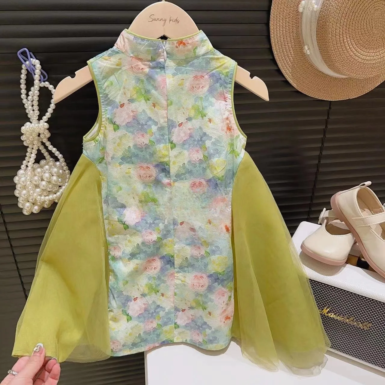 Girls Casual Summer Sundress Princess-Style Floral Pattern Children Cheongsam Skirt Knee-Length Flower Dress