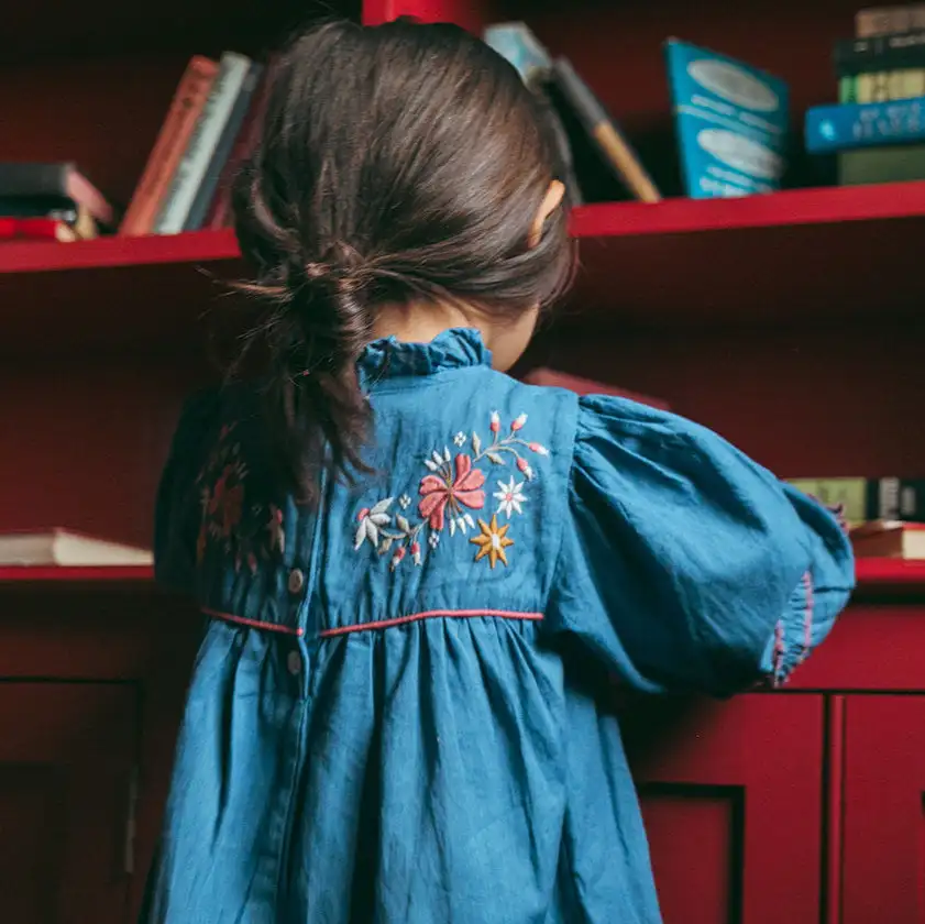 Customized OEM and ODM Elegant Deep Indigo Blue Embroidery Flora Long Sleeve Zipper Girls Dress Outfit