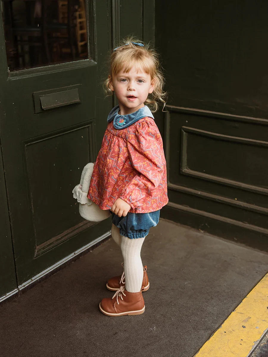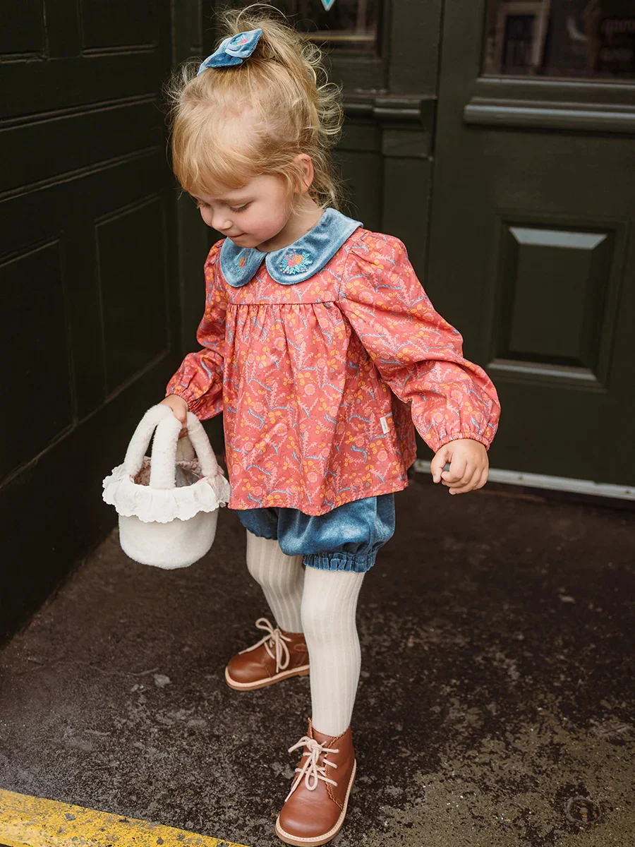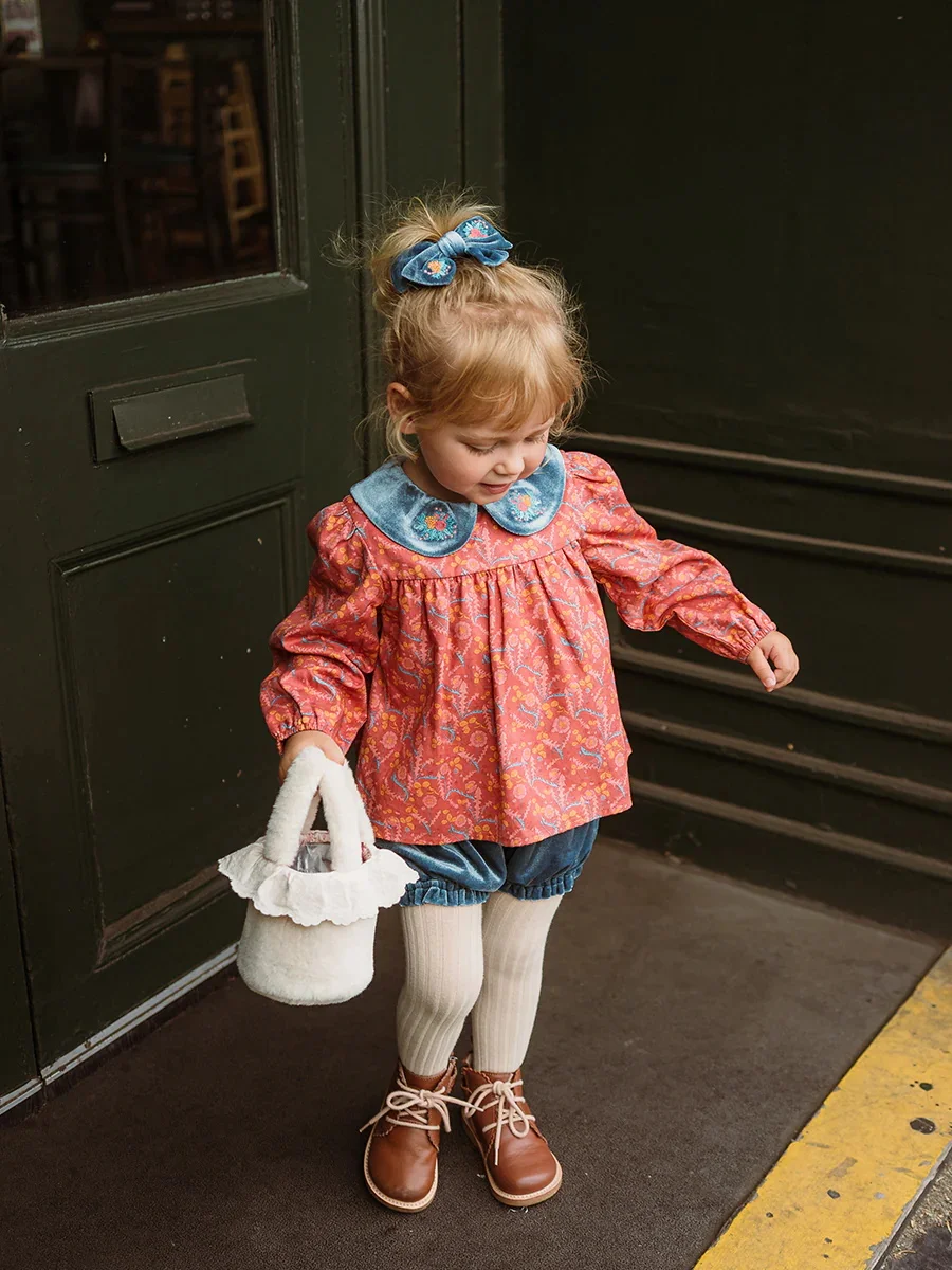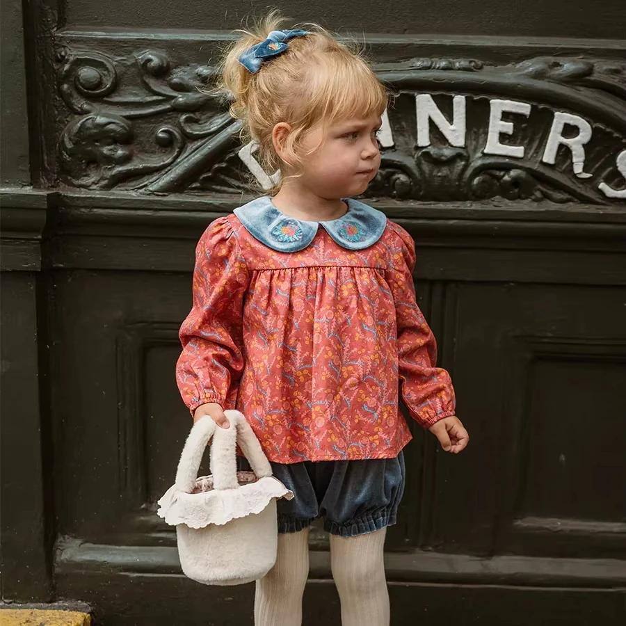 Girls Long-Sleeved Red Shirts Pullovers Tie-Dyed Printed Doll Collar Blouses-Top Polyester/Cotton