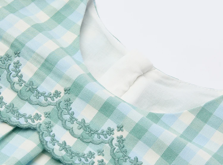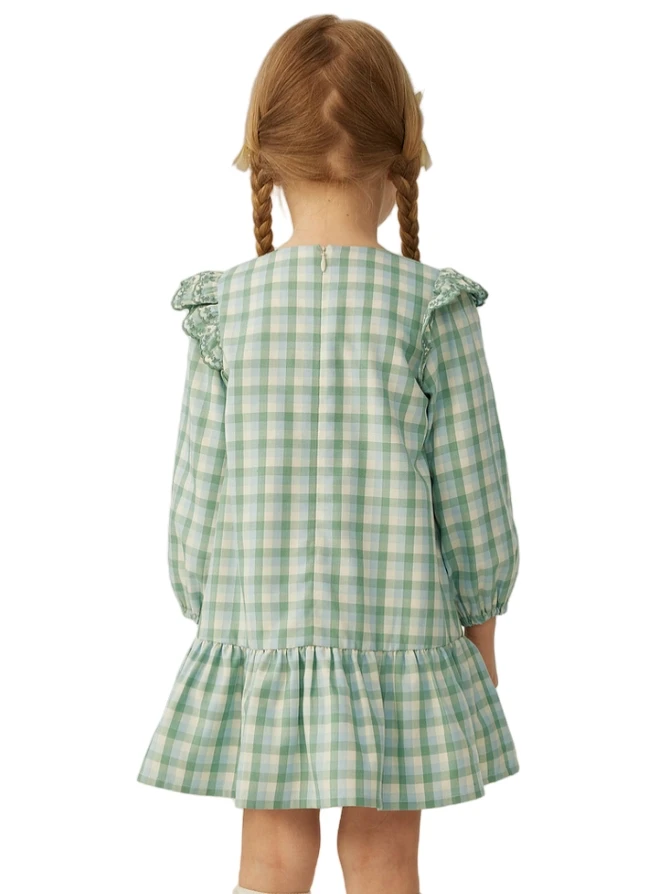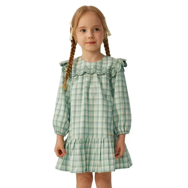 Custom Fashionable Embroidered Lace O-neck Full-sleeve Loose Checkered Autumn Girls' Dress with a Casual Style