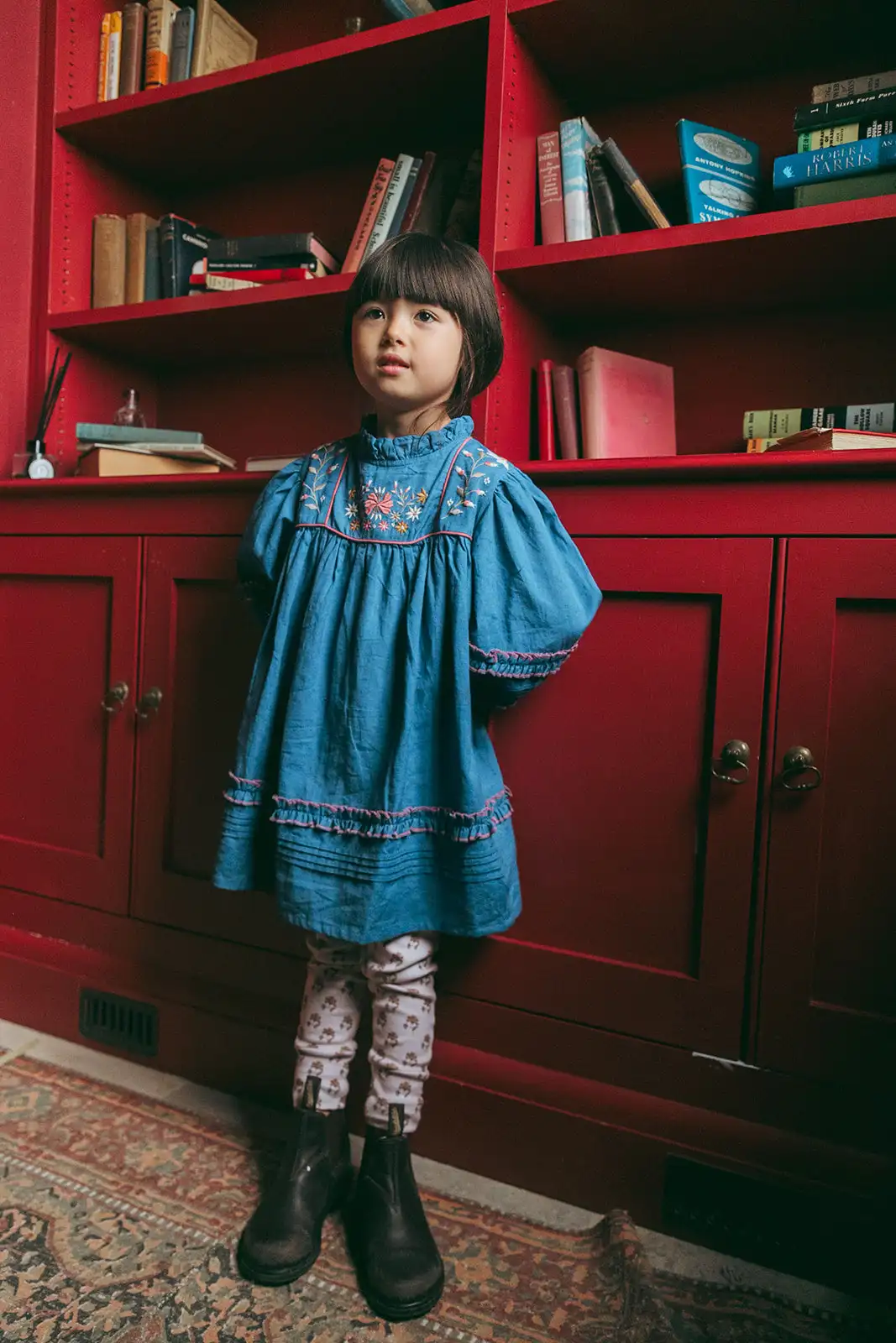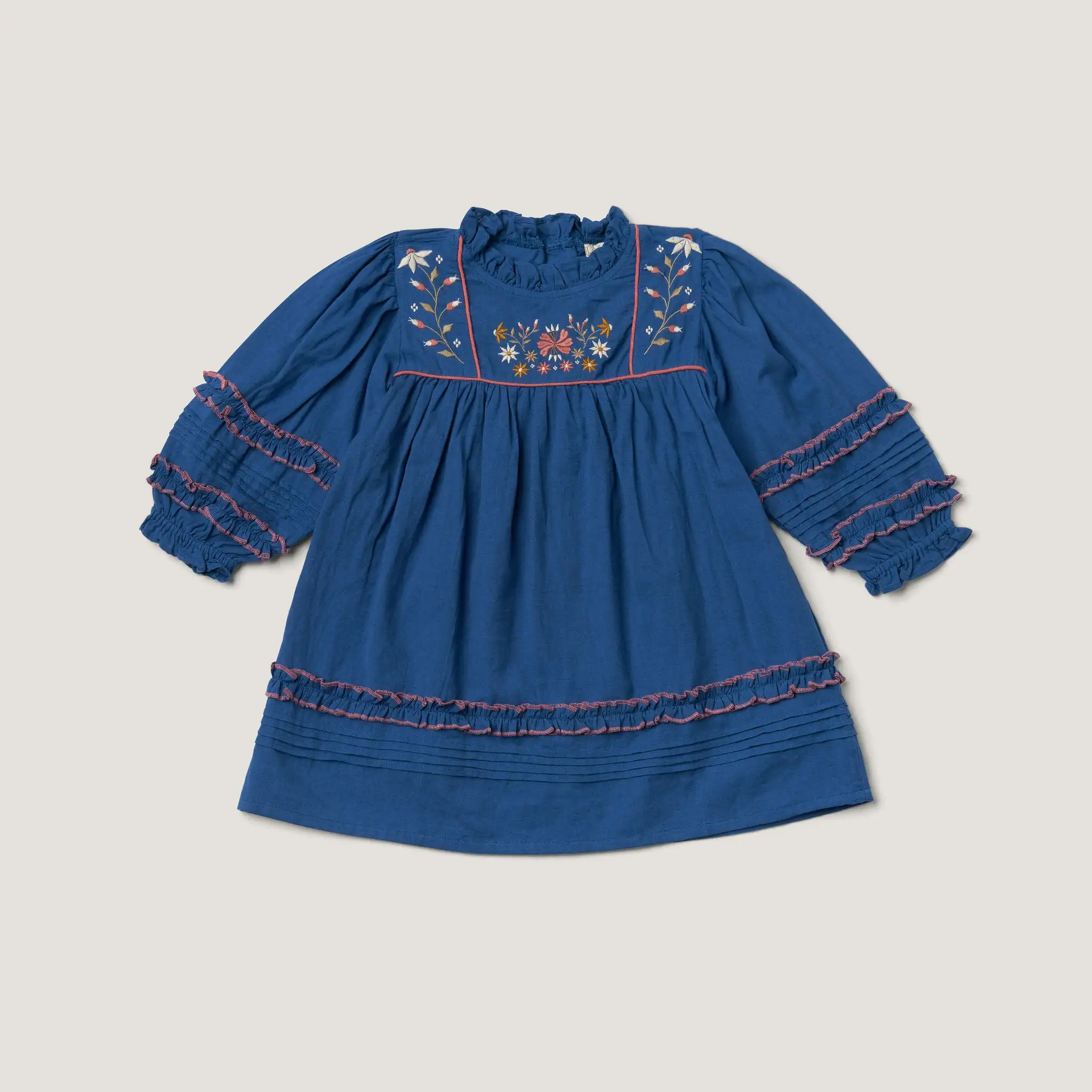 Good Quality Elegant Deep Indigo Blue Embroidery Flora Long Sleeve Zipper Girls Dress Outfit