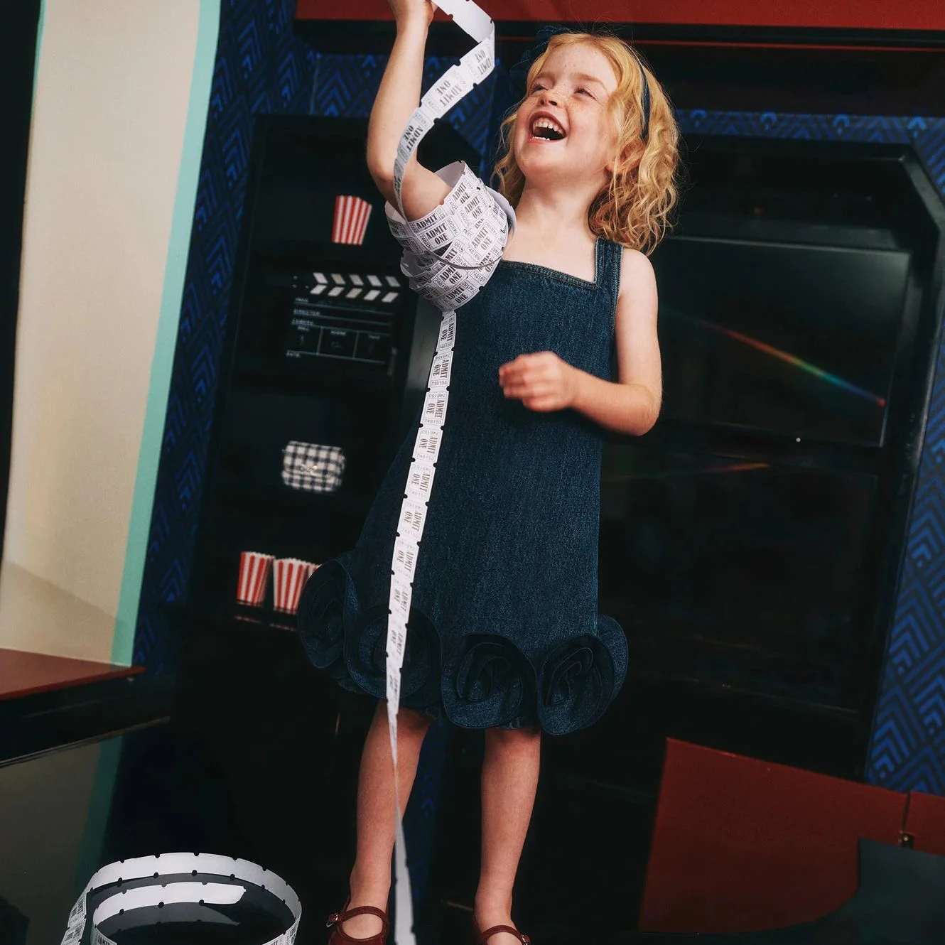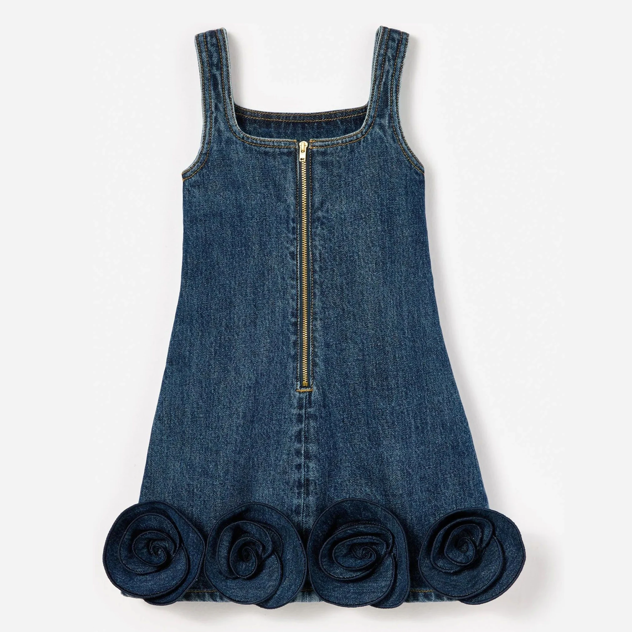 Custom Summer Girls' Denim Dress Sculptural Flowers Hem Square Neckline-Casual 100% Cotton Breathable Eco-Friendly Knee-Length