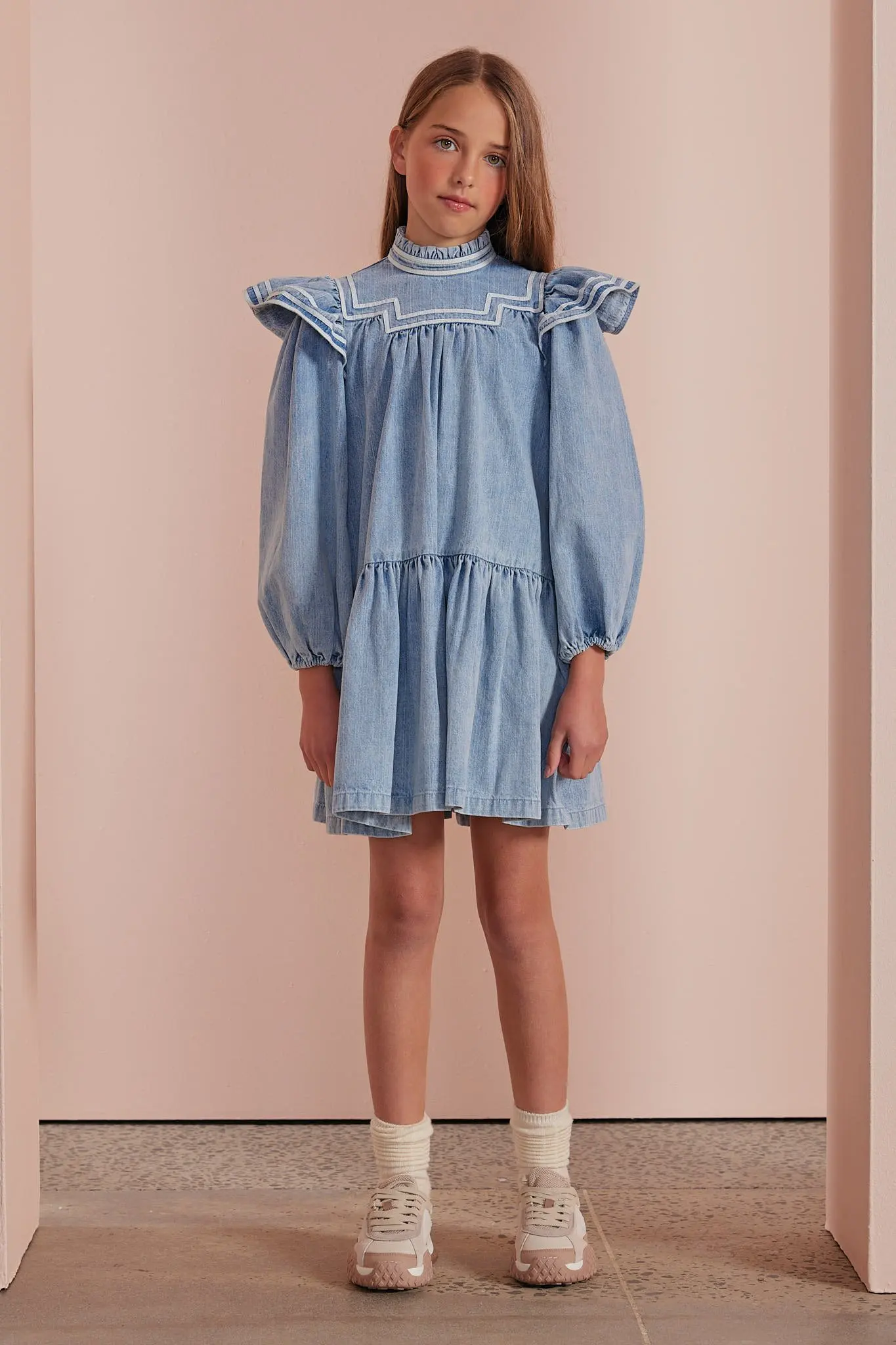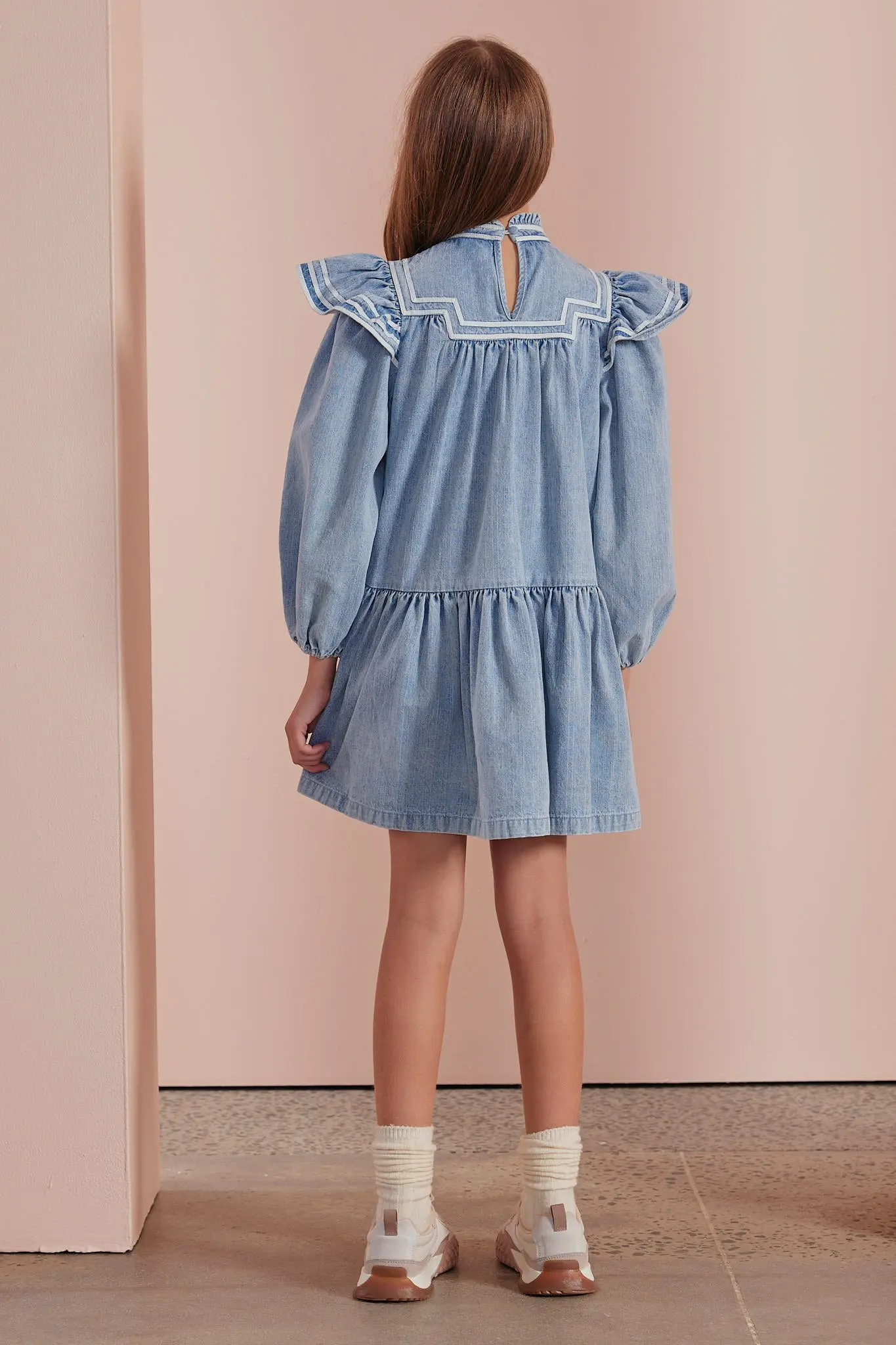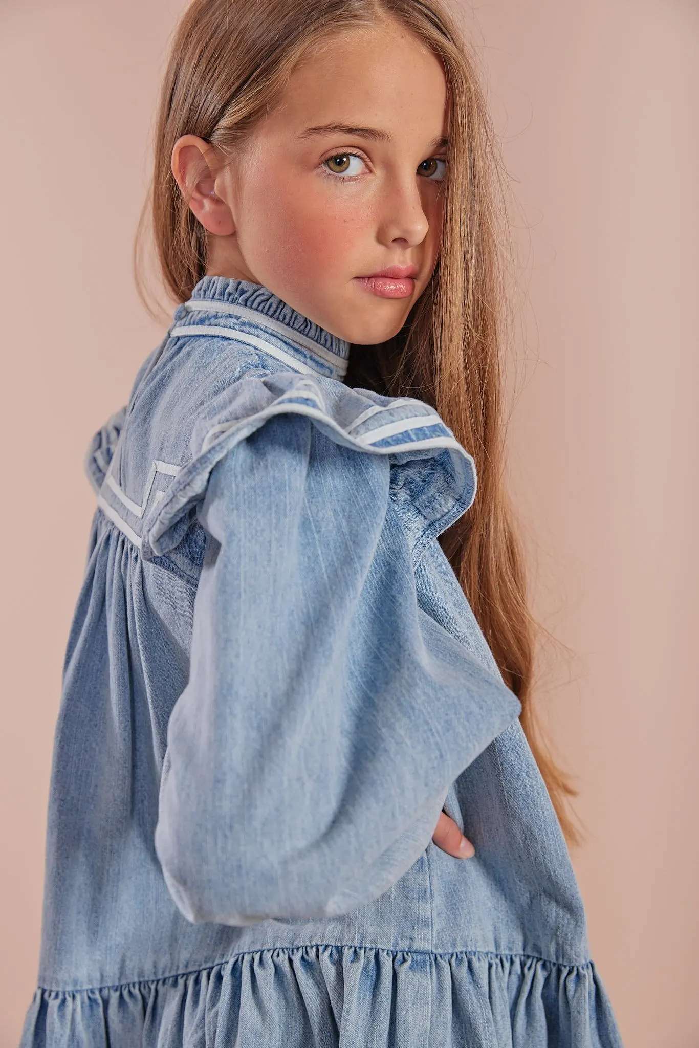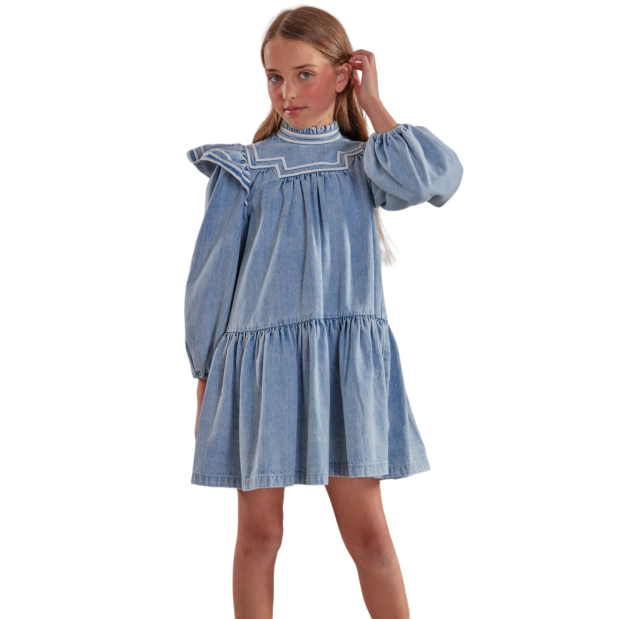 Custom Light Blue Long Sleeve Kids Denim Dress Fall Formal Acid Wash With Ruffle Detail on Sleeve Latest Design for Girls