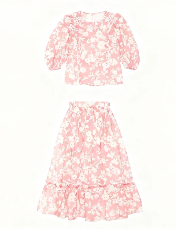 Adolescent Girls Children Suit 6 Years Casual Summer Eco-friendly White Sleeveless Floral Leaves Print Slip Shirt Pink Ruffle