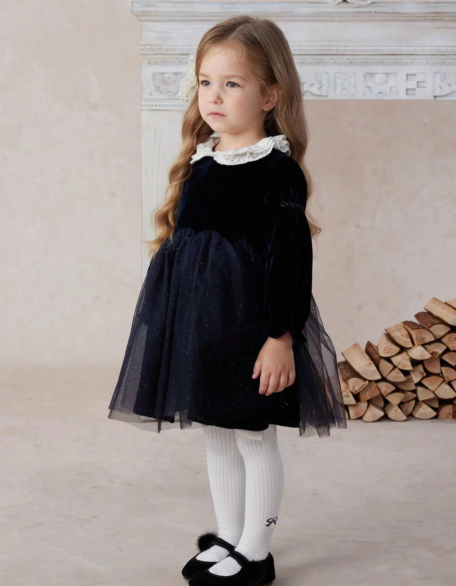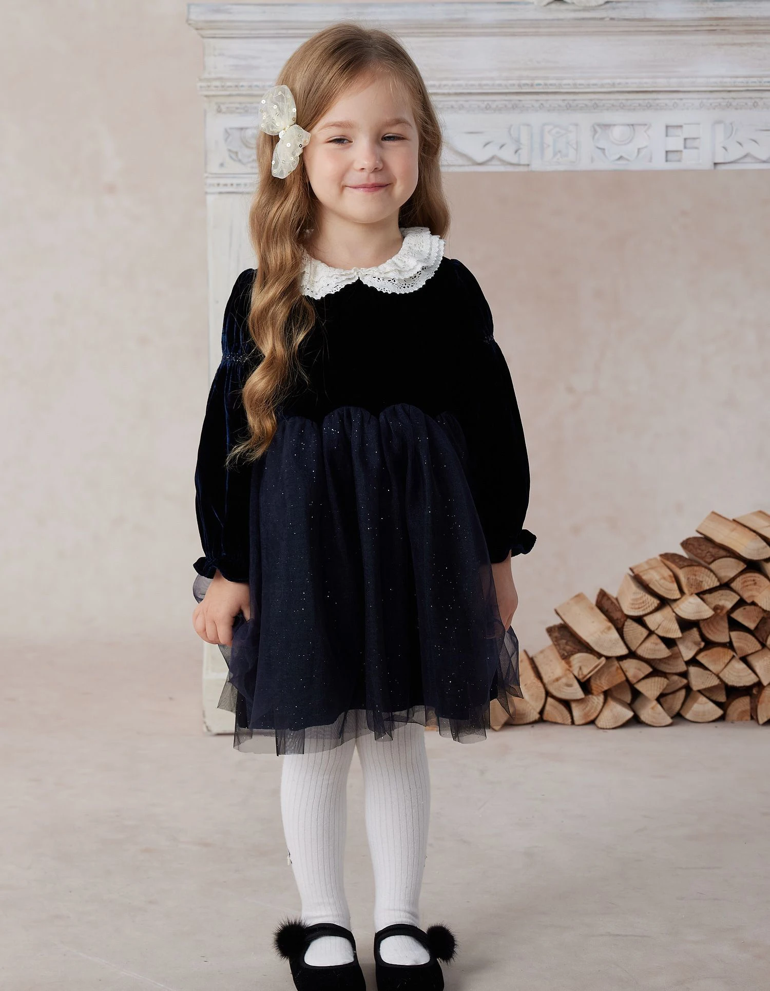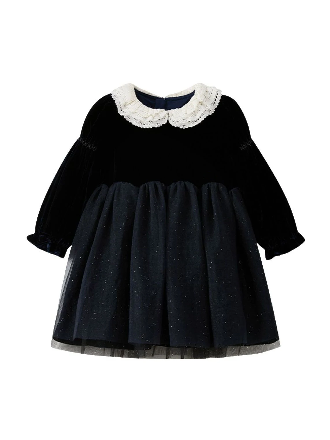Good Quality Elegant Soft Velvet White Lace Peter Pan Collar Long Sleeves Girls Dress Outfit