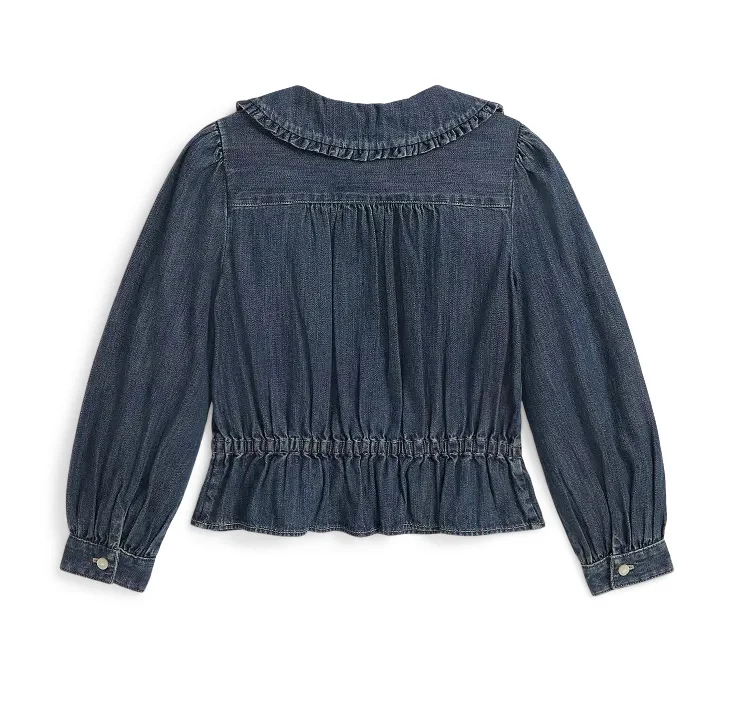 Custom Private Label Winter Long Sleeve Washed Denim Casual Ruffles Shirts for Girls Unique Pleat Blouse Kids Clothing