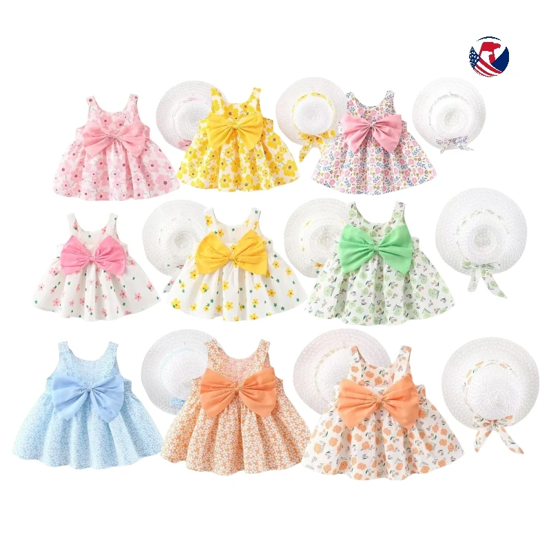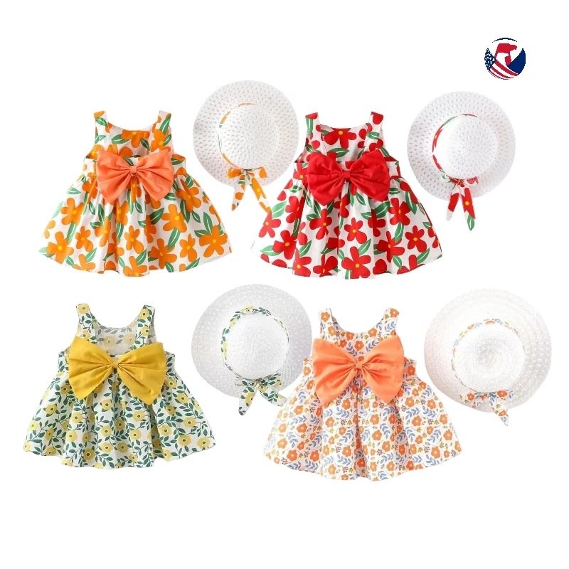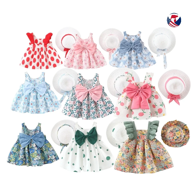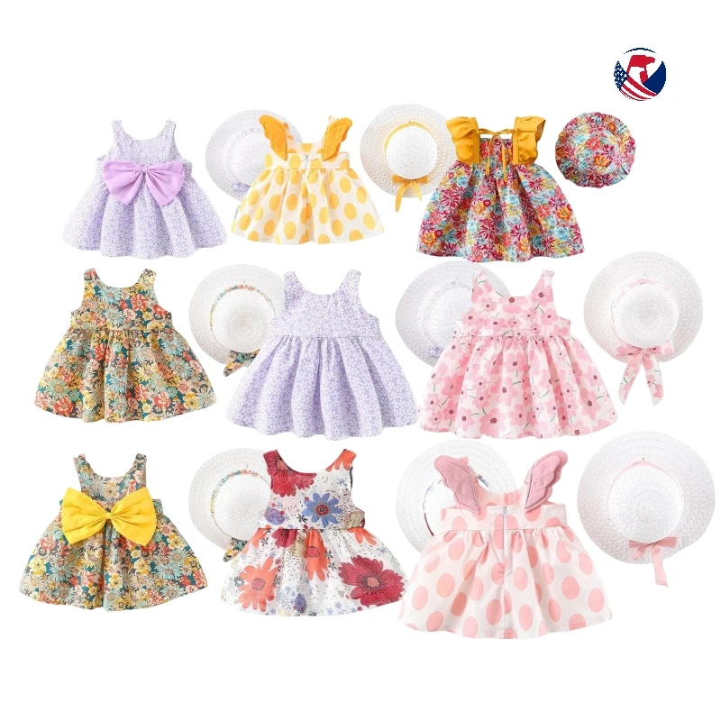 Toddler Baby Girl Fashion Clothing Floral Lemon Polka Dot Print Beach Dress Straw Hat Little Kids Clothes 2 Piece Set