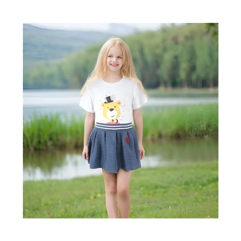 Girls Two Piece Outfit Customizable Cute T Shirt with 3D Bear Embroidery and Lace Trim Skirt Summer Apparel