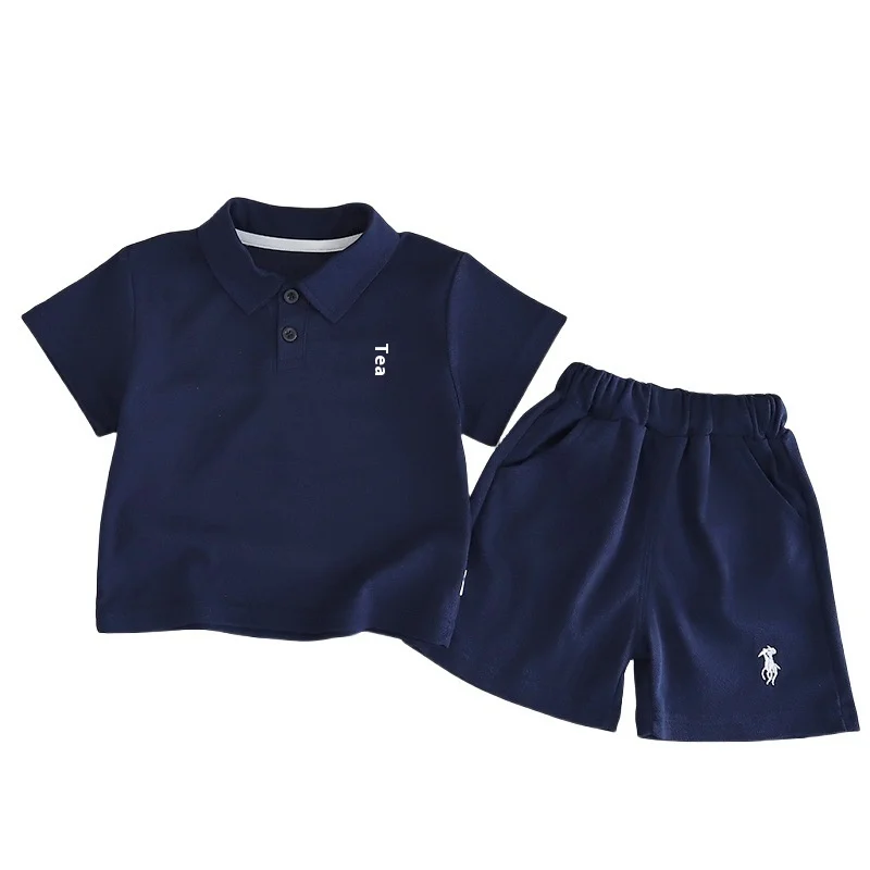 Kids Clothing Summer Boys T-Shirt Set Outfit Pattern Turn-Down Collar Solid Color Short Sleeves Boy Clothing Set