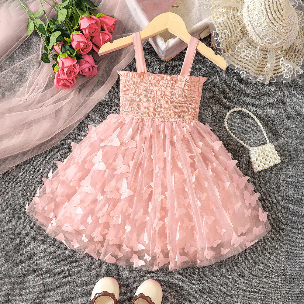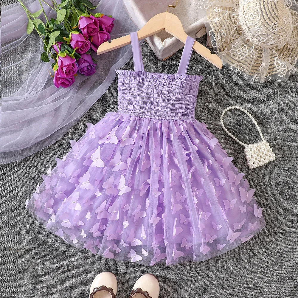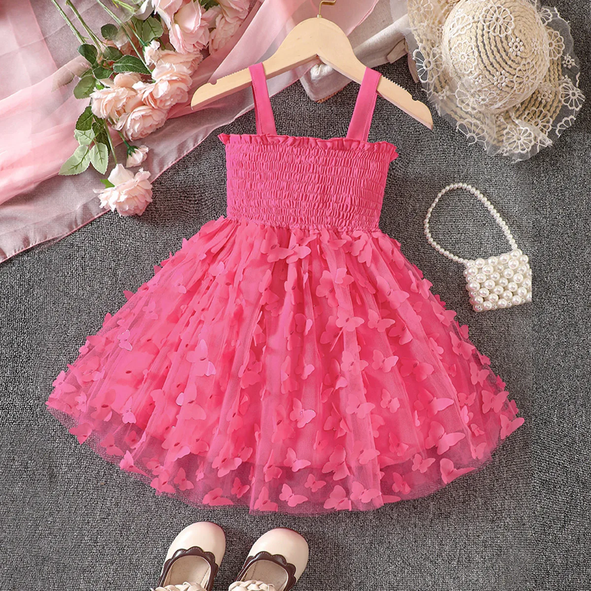 Girls' Summer Casual O-Neck Dress Lace Decoration Solid Strap Mesh Butterfly Design ODM Children's Age Group Dress for Girls