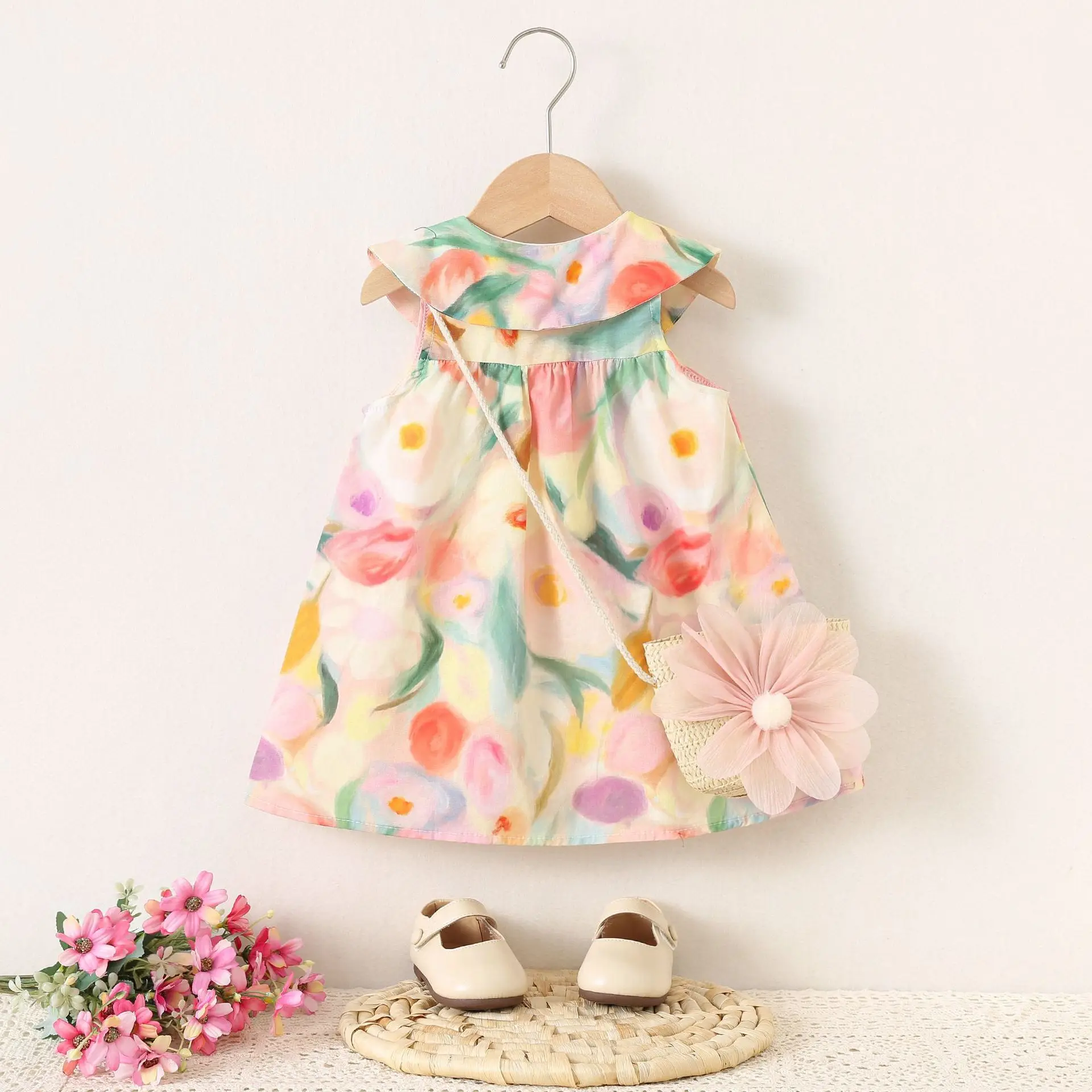 Girls Summer New Dress Floral Pattern Princess Dress Lapel Ruffles Cotton Casual Dresses for Girls