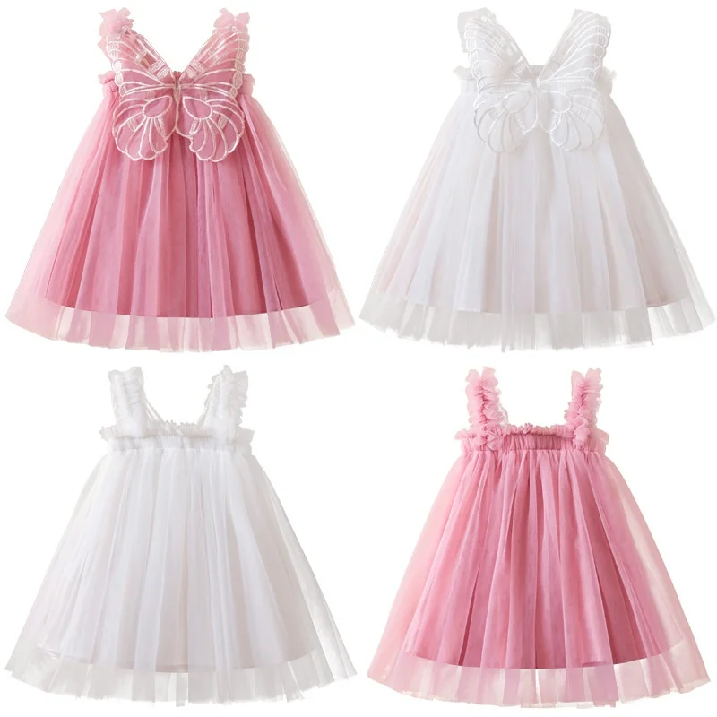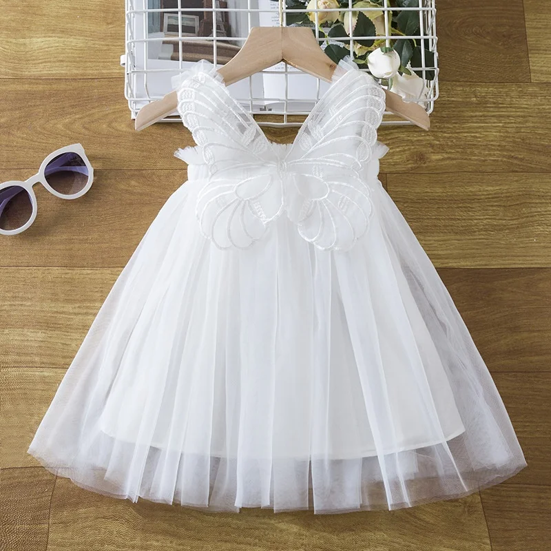 Summer Girls' Princess Dress 3D Wings O-Neck Puffy Mesh Little Stylish Dress Solid Dresses for Girls