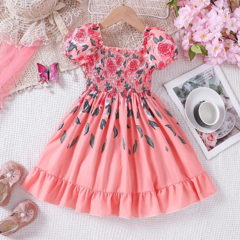 Girls' Romantic Rose Dress for Summer Vacation Sweet Floral Pattern O-Neck Collar Ruffle Girls Dresses for Girls