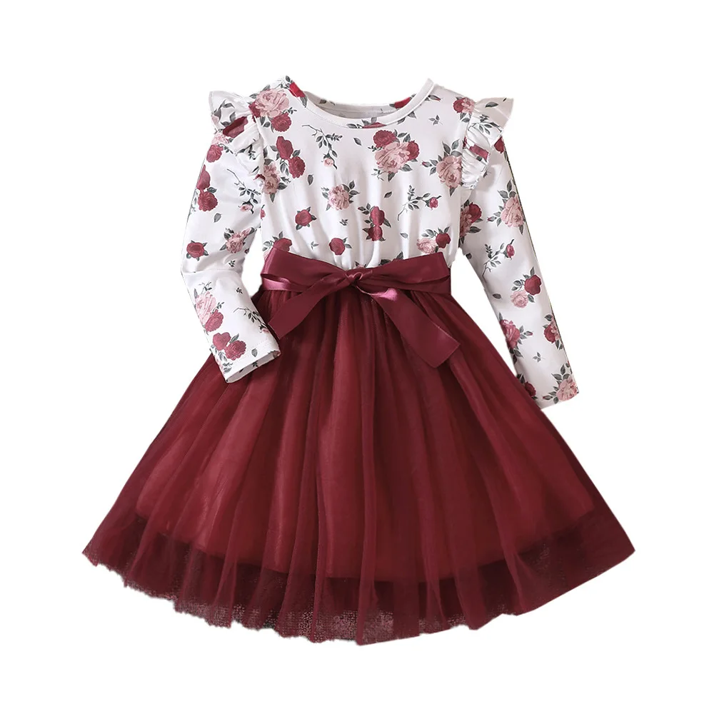Spring Fall Flying Long-Sleeved Printed Mesh Girls Dresses for Girls