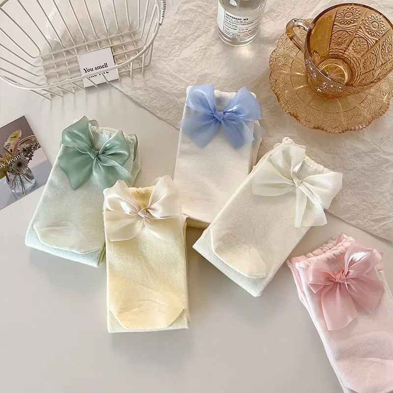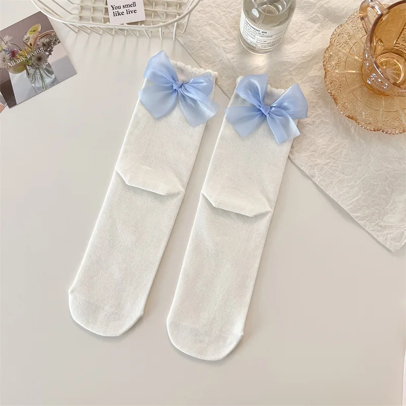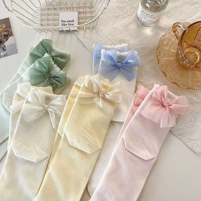Custom Logo Cute Candy-Colored Lace Forest Bow Knot Mid-Tube Fairy Thin Girls Socks Knitted Casual High-Ankle Socks for Autumn
