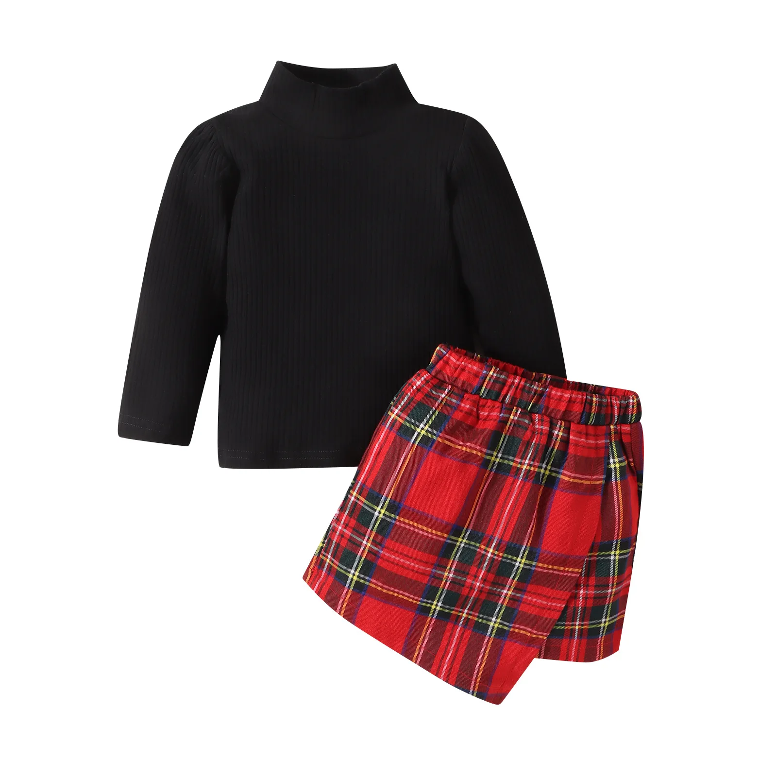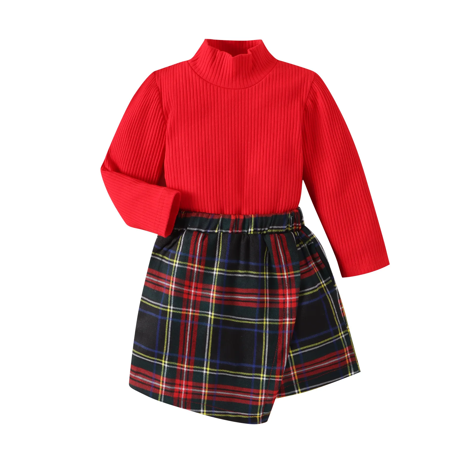 Two-Piece Casual Outfits for Girls Red Plaid Skirt and Top Set for Autumn and Christmas/New Year Kids Clothing