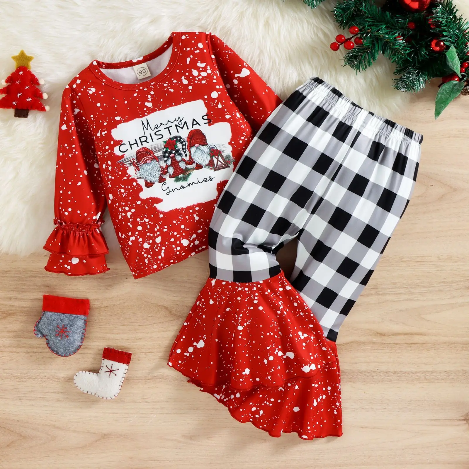 Autumn Casual Toddler Girls Clothing Sets Christmas Snowman Print Plaid Flared Pants with Long-Sleeved Outfits for Kids