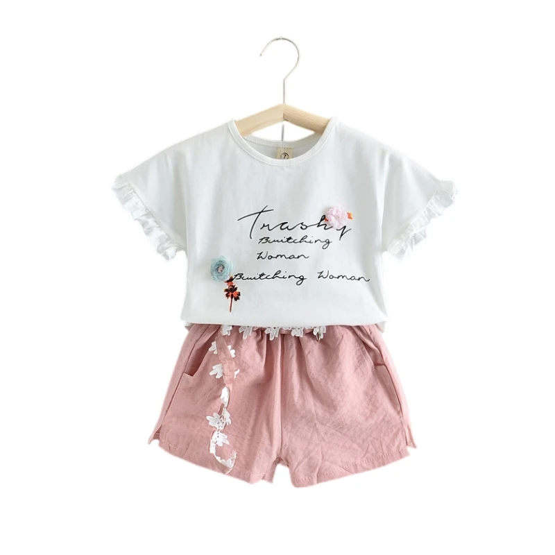 Girls Two Piece Outfit Customizable Cute T Shirt with 3D Bear Embroidery and Lace Trim Skirt Summer Apparel