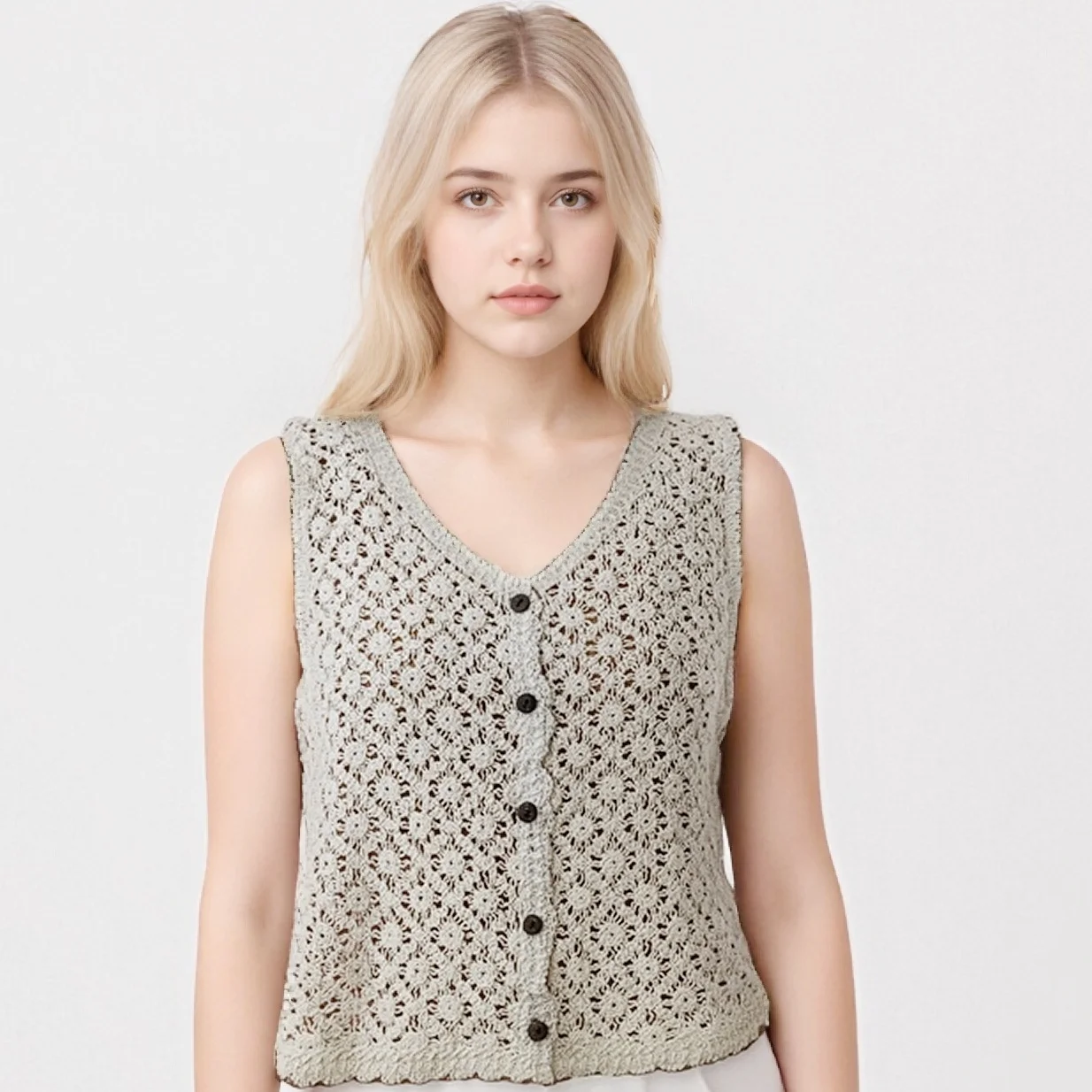 Autumn Summer Women's Casual Eco-Friendly Short Crochet Cotton Vest Handmade Knitted Tank Top V-neck Single Breasted Solid