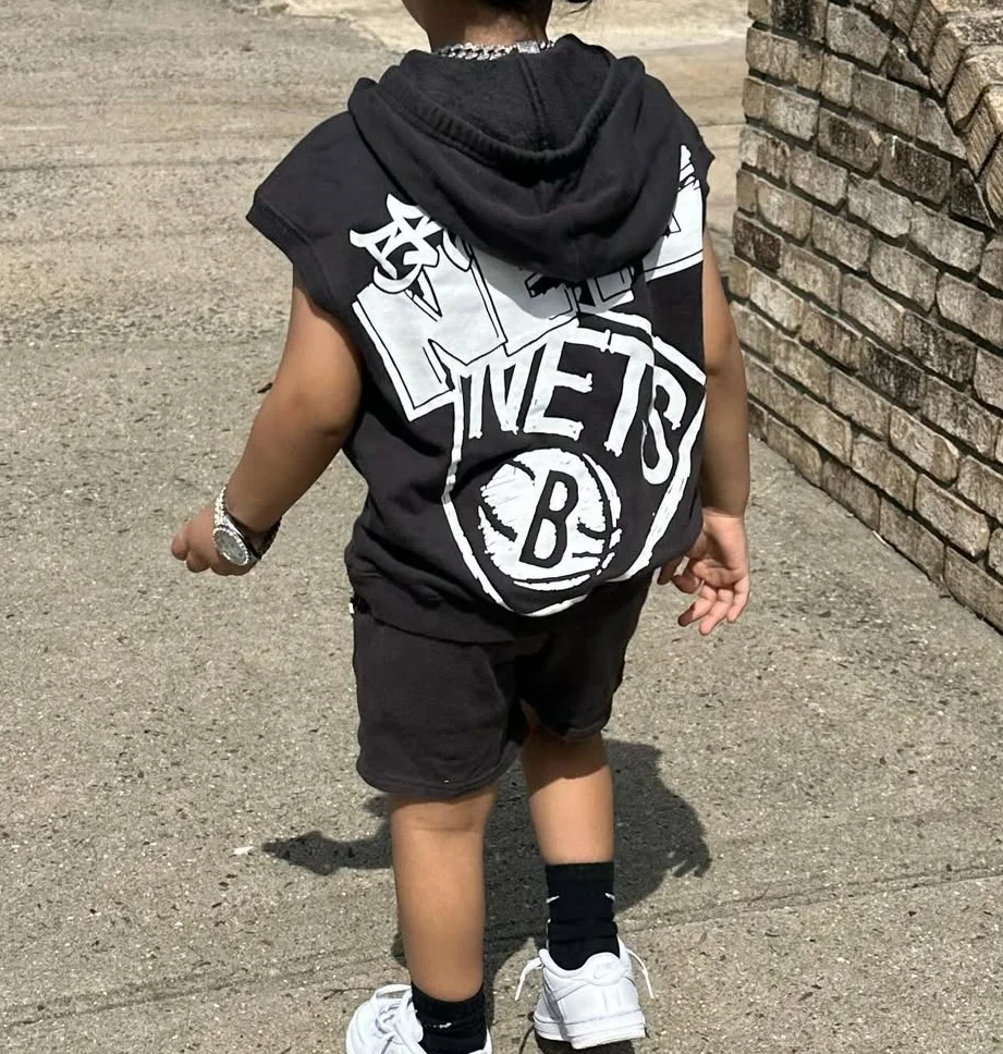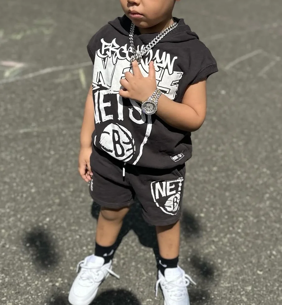 Custom Printed Sleeveless Hooded Sweatshirt Vest and Elastic Waisted Shorts Sports Suit Boys Summer Clothing Set for Street Wear