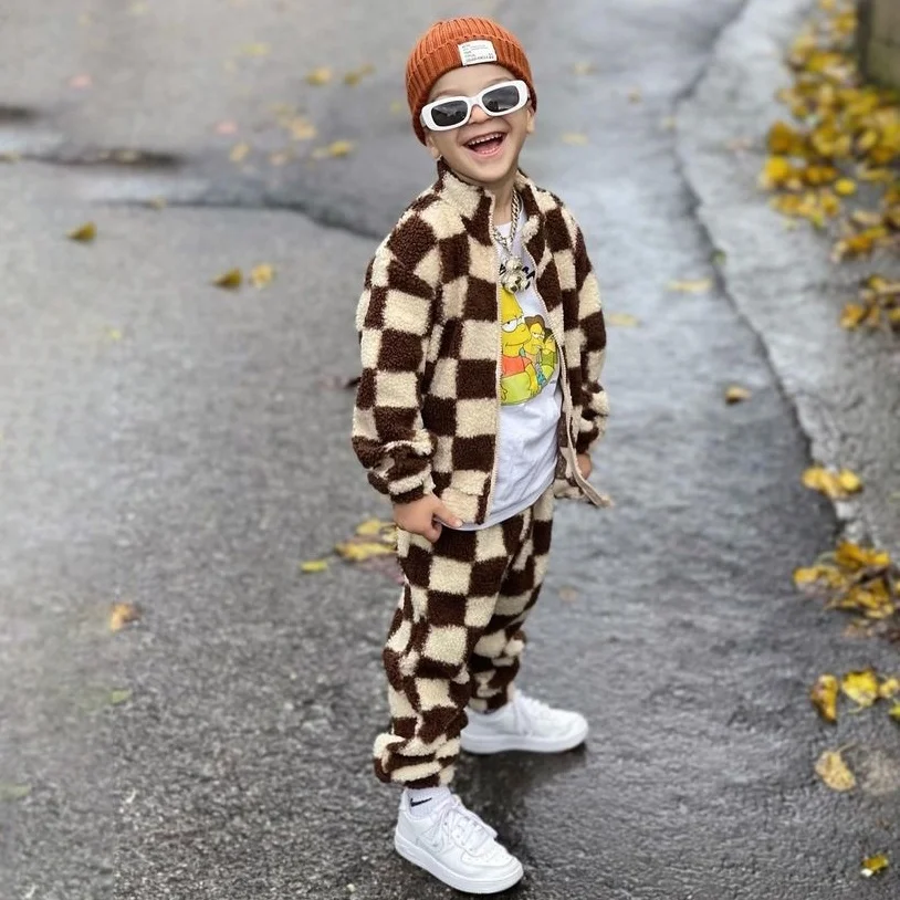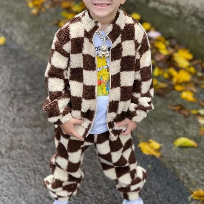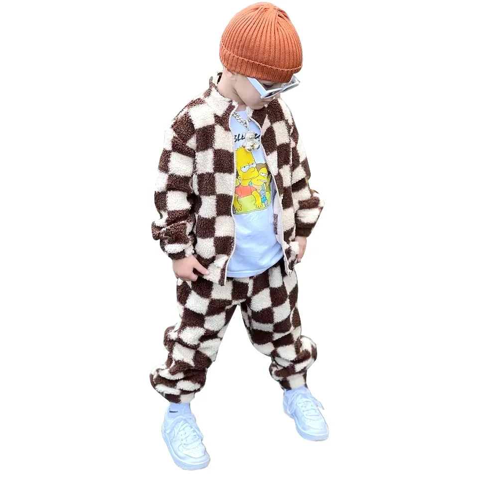 Kids Clothes Vendor Fleece Sherpa Cotton Zip Jacket Jogger Sets Checkerboard Boys Clothing Sets
