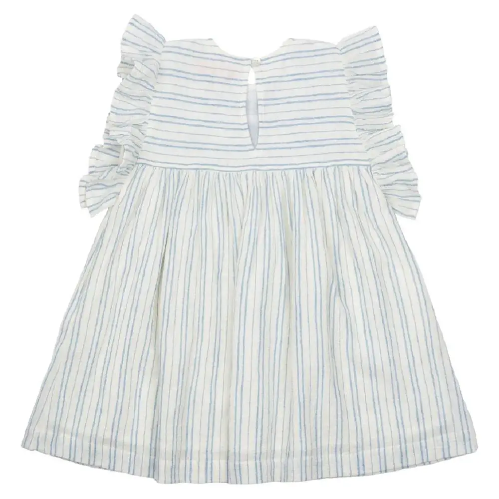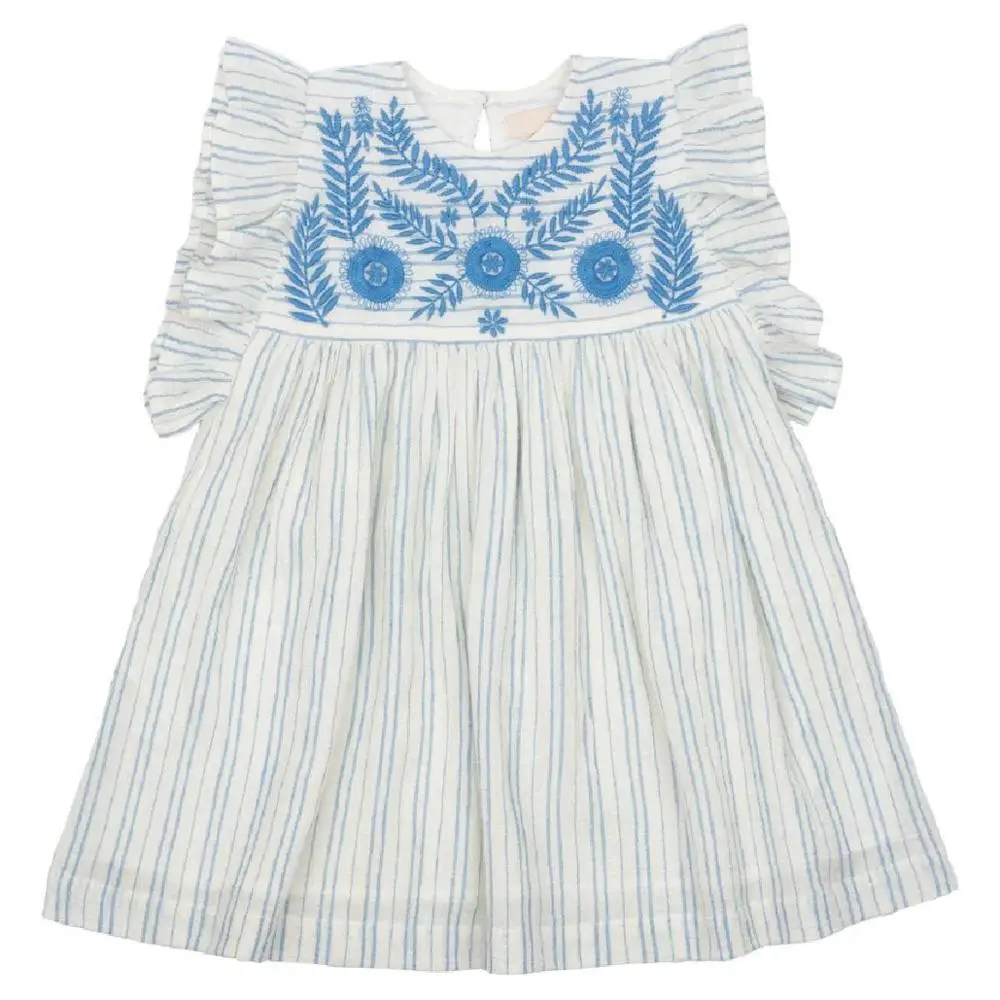 Children Summer Clothes Ruffle Sleeves Blue Stripe 100% Cotton Floral Embroidered Girls Dress