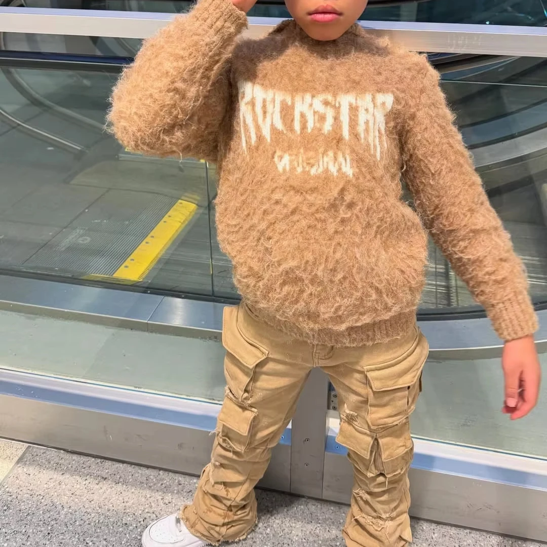 New Design Streetwear Pullover Printed Letters Workwear Pants Multi Pocket Jogger Washable Custom Logo Mohair Kids Clothing Sets