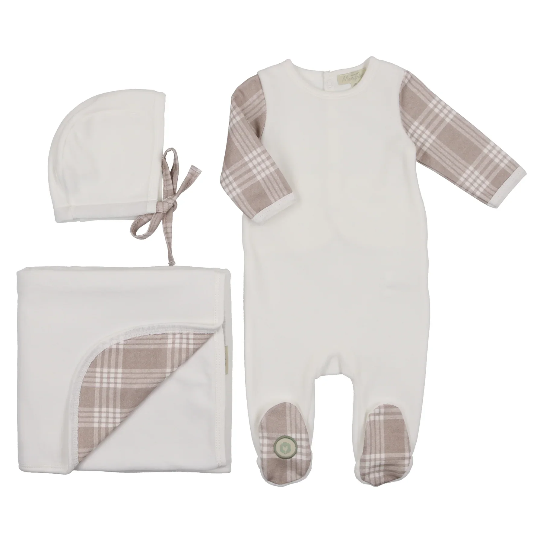 2026 Wholesale Customize OEM/ODM Set Color Blocked Grid Long Sleeve Footie Romper Blanket Hat Baby Sleepwear Pajamas Set