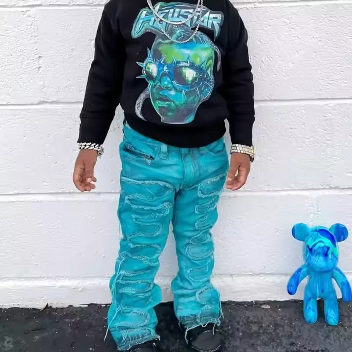 Wholesale Custom High Street Washed Damaged Patch Boys Jeans Fashion Designer Distressed Skinny Ripped Jeans for Kids