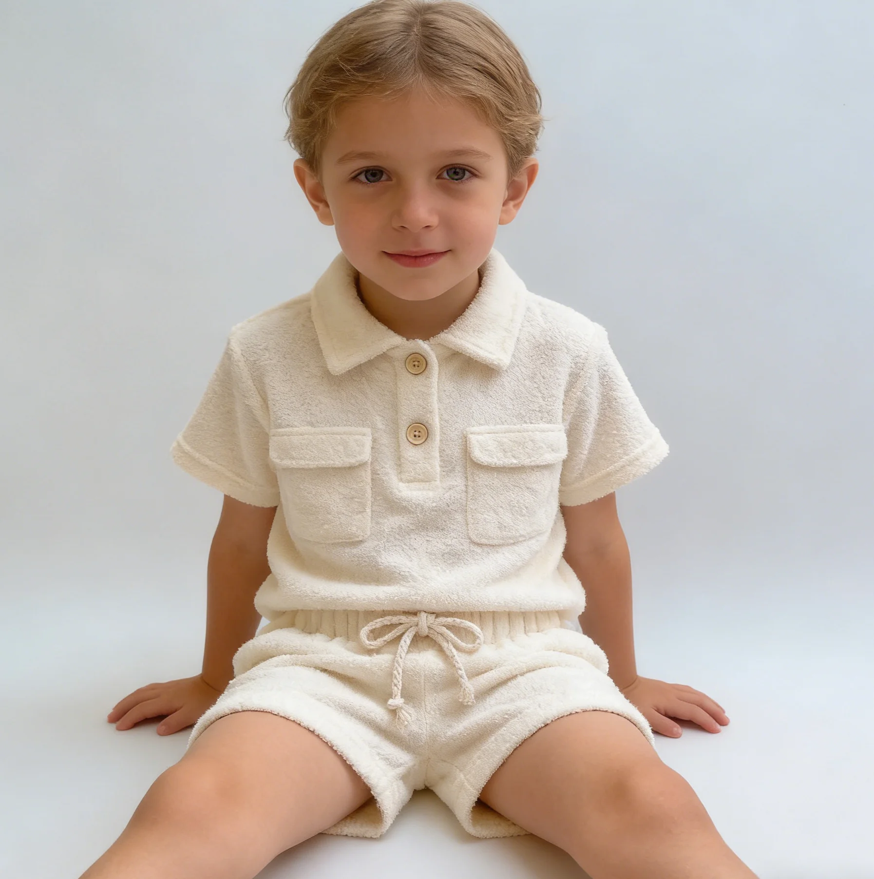 2026 Custom Logo Baby Clothes Summer Trendy Comic Print Boutique Short Sleeve Toweling Two Piece Kids Clothing Sets