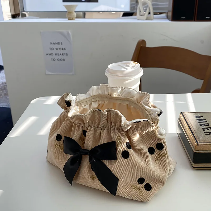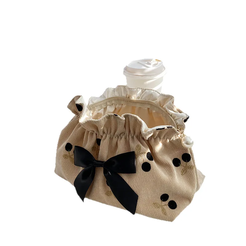 custom logo Corduroy Fruit Print Zipper Closure Cute Bow Large Capacity Pearl Embellish Travel Makeup Bag